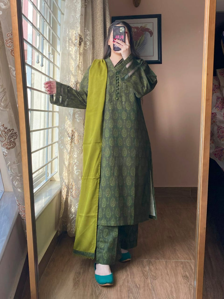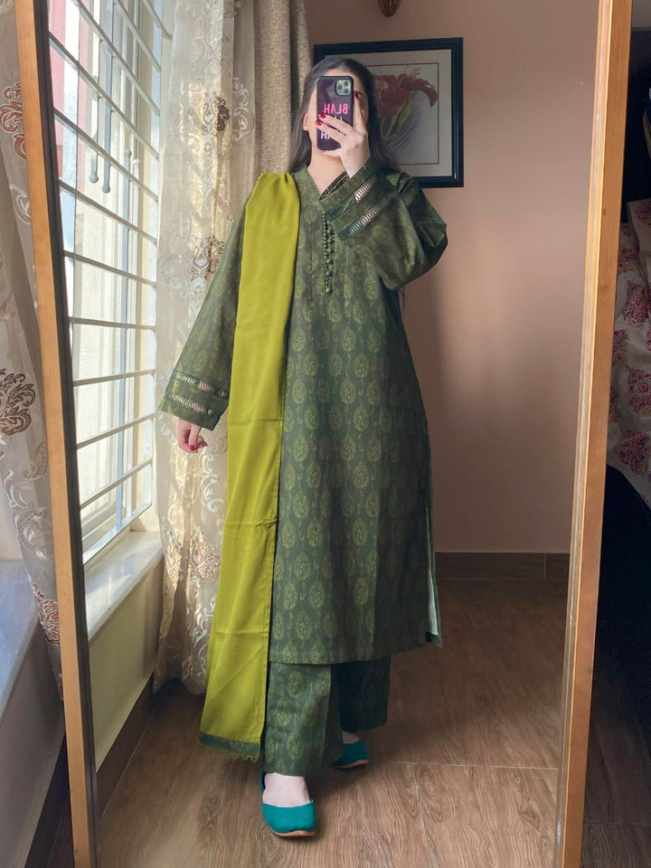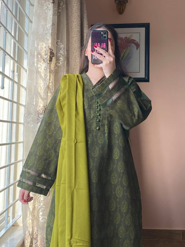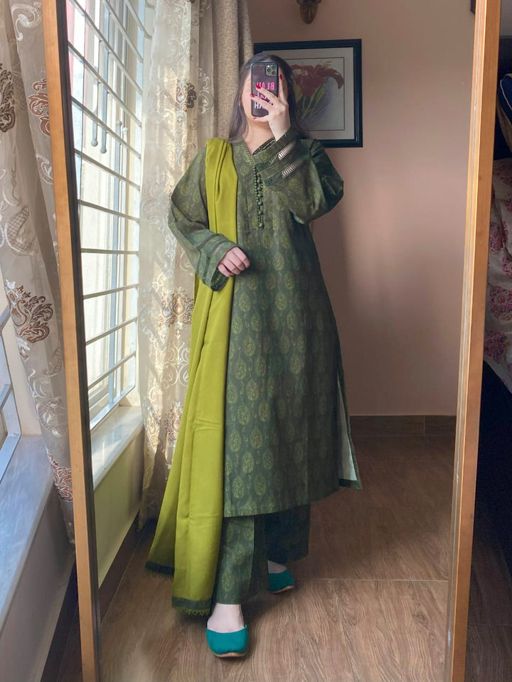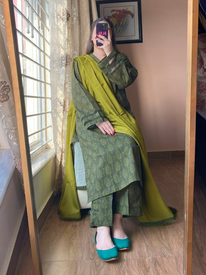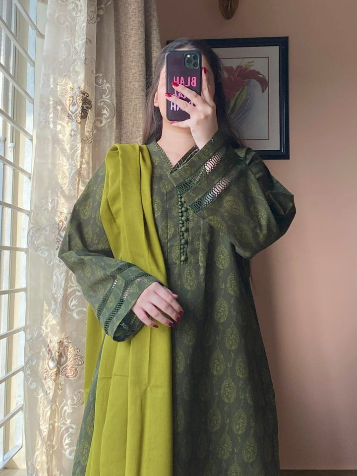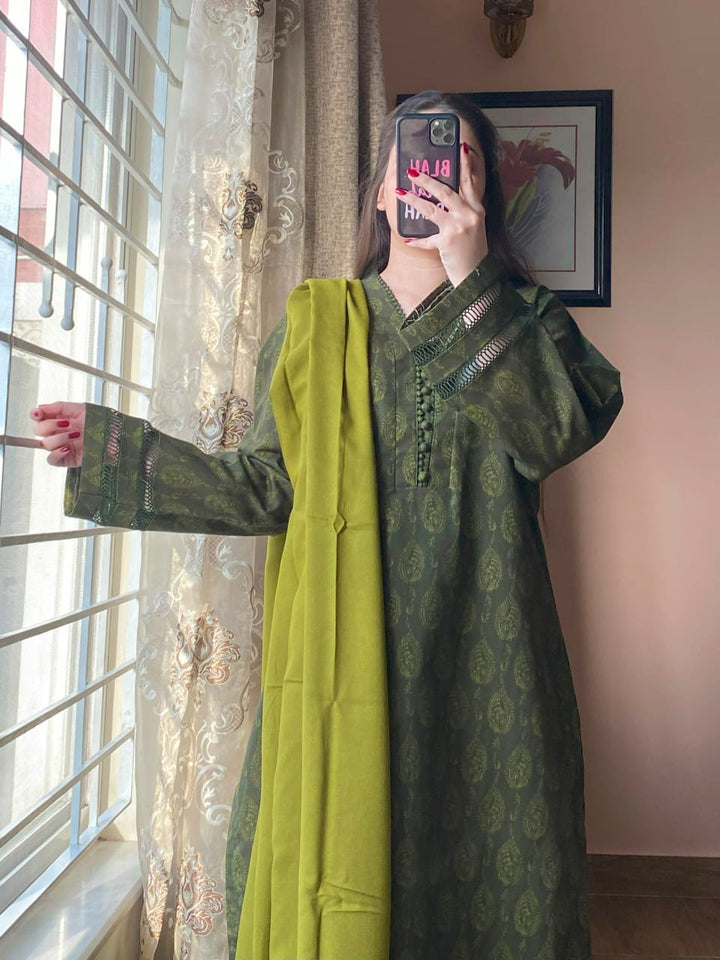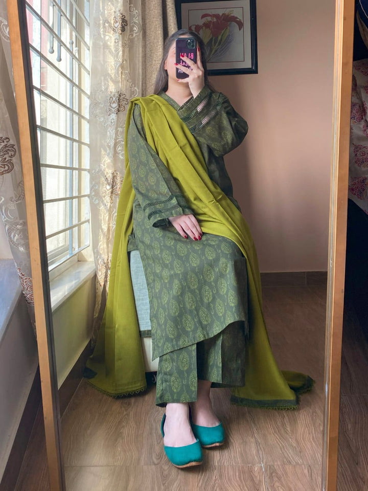 A timeless blend of comfort and elegance, this 3-piece printed Slub Khaddar suit features intricate lace detailing and a warm Dhanak shawl — perfect for refined winter styling.