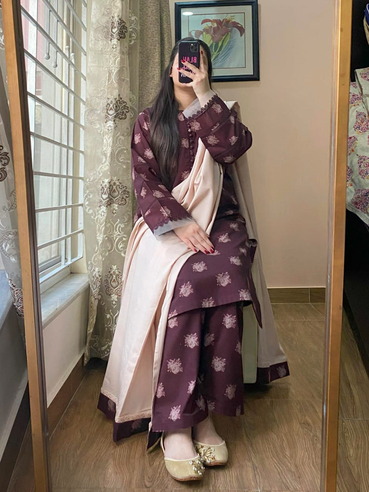 A graceful fusion of tradition and modern elegance, this 3-piece Premium Slub Khaddar suit is designed to elevate your winter wardrobe with timeless charm and warmth.