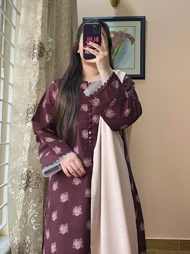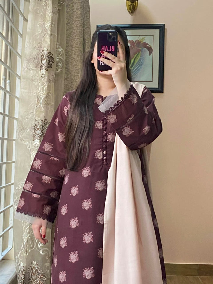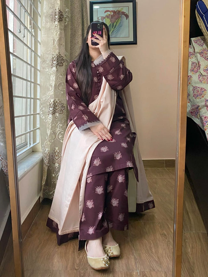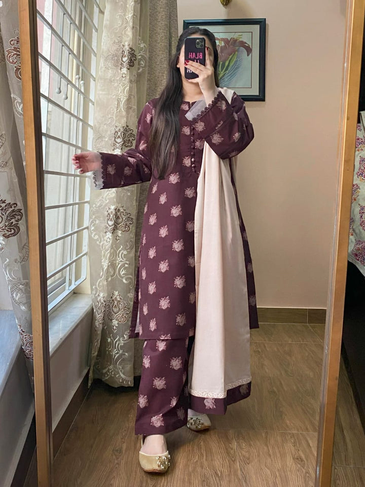 3-PIECE KHADDAR PRINTED STITCHED SUIT WITH SHALWAR