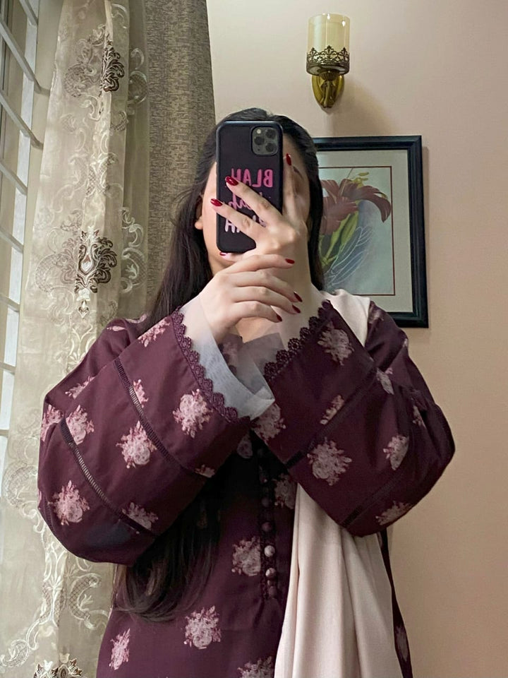 Shirt – Crafted from premium printed Slub Khaddar, the shirt showcases refined tailoring with delicate button detailing on the neckline. The sleeves are beautifully adorned with a combination of intricate laces and soft net fabric, adding depth and a touch of femininity to the design.