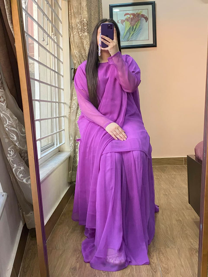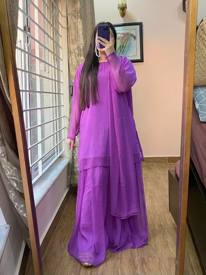 3 Piece - Chiffon Dress With Sharara and Chiffon Dupatta
