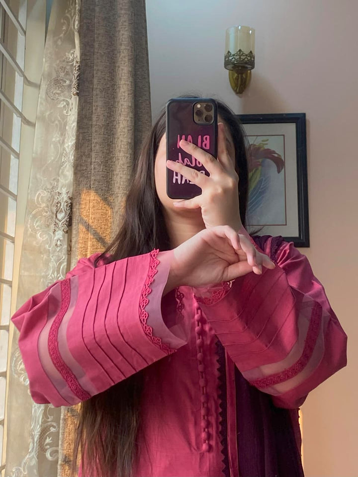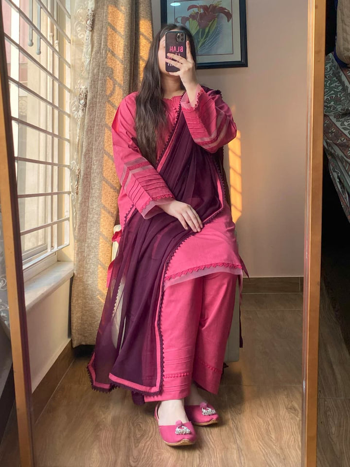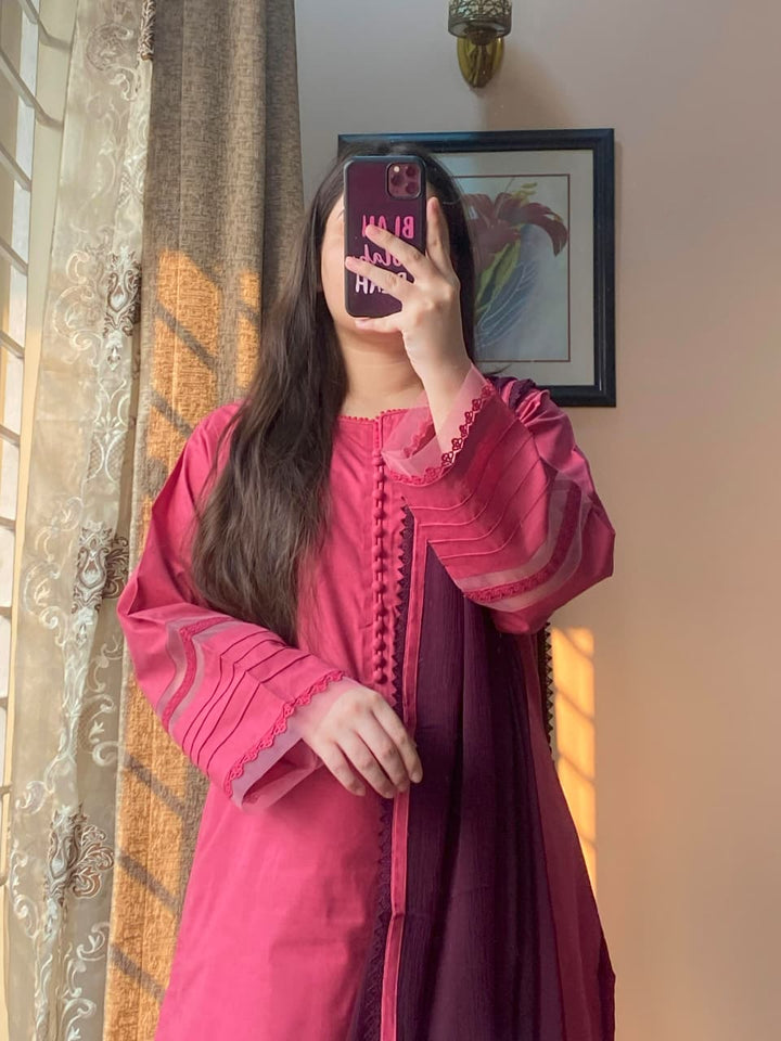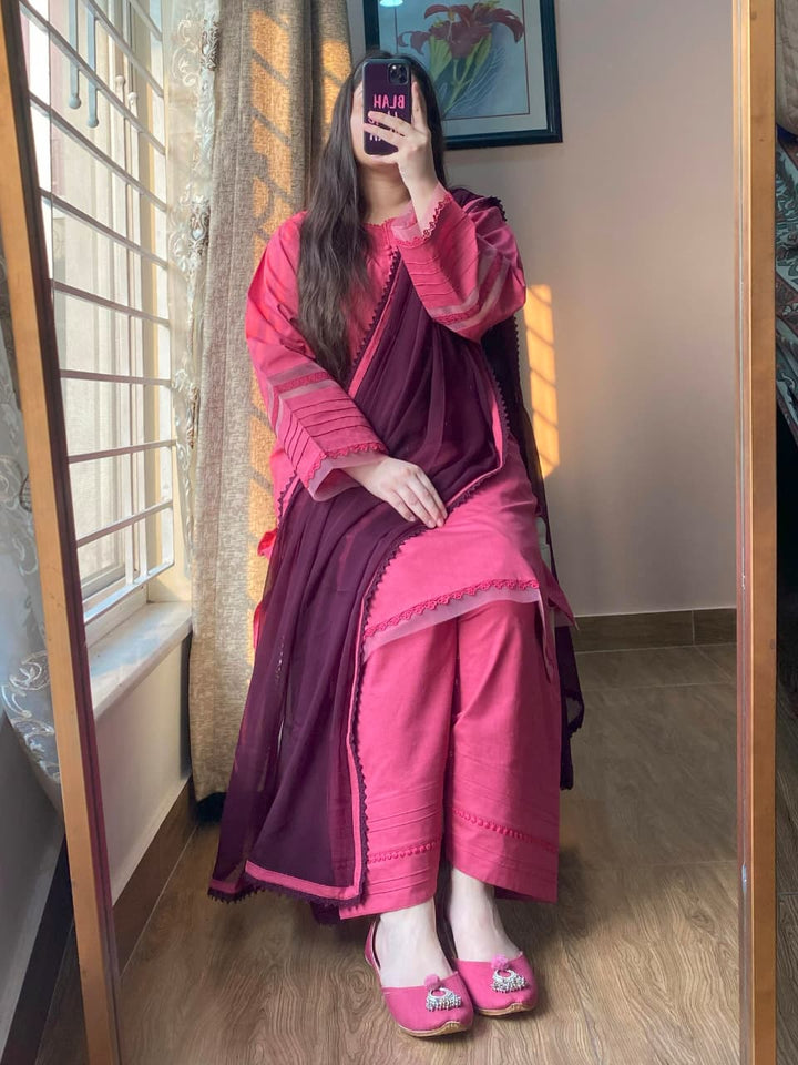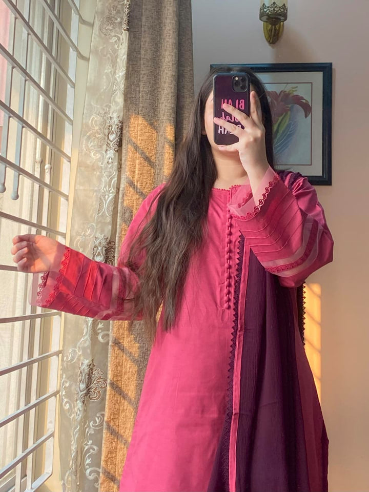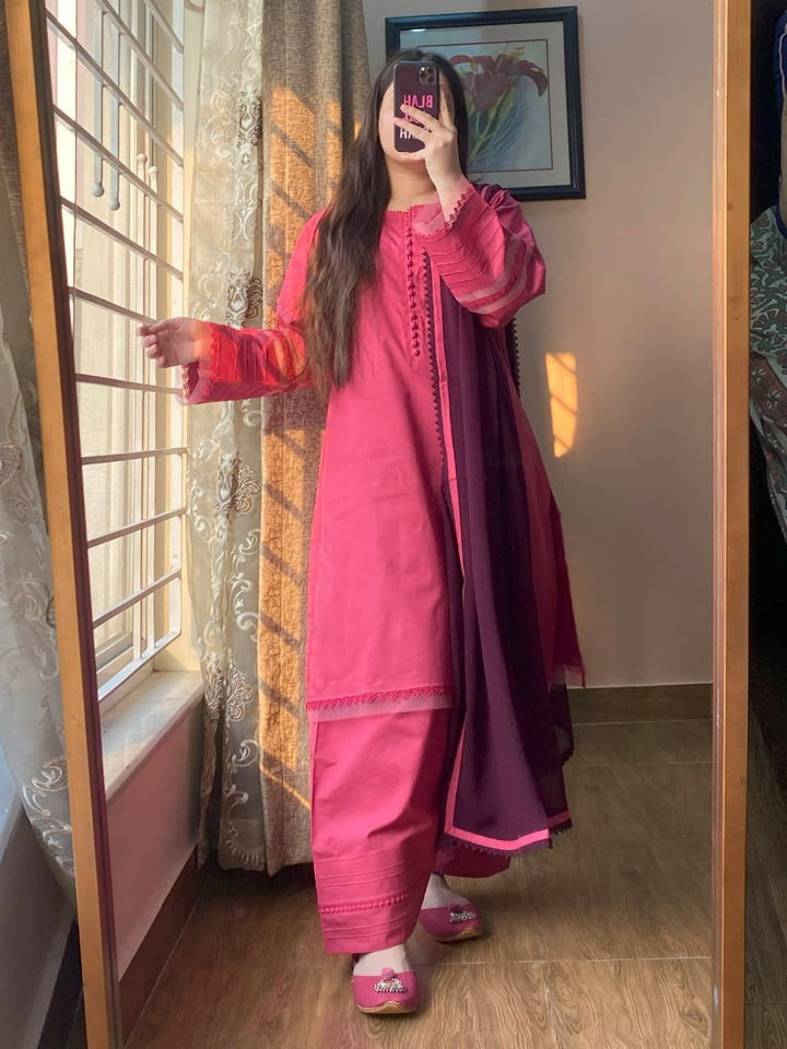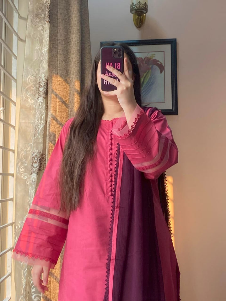 Dupatta – Completing the ensemble is a lightweight chiffon dupatta that drapes effortlessly. Two corners are tastefully finished with lace, adding a soft decorative element while maintaining the overall elegance of the set.
