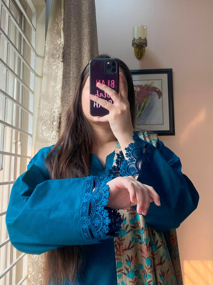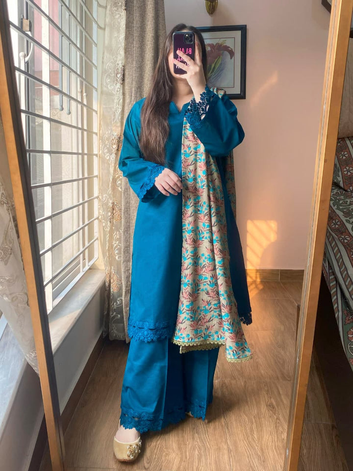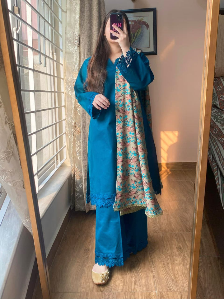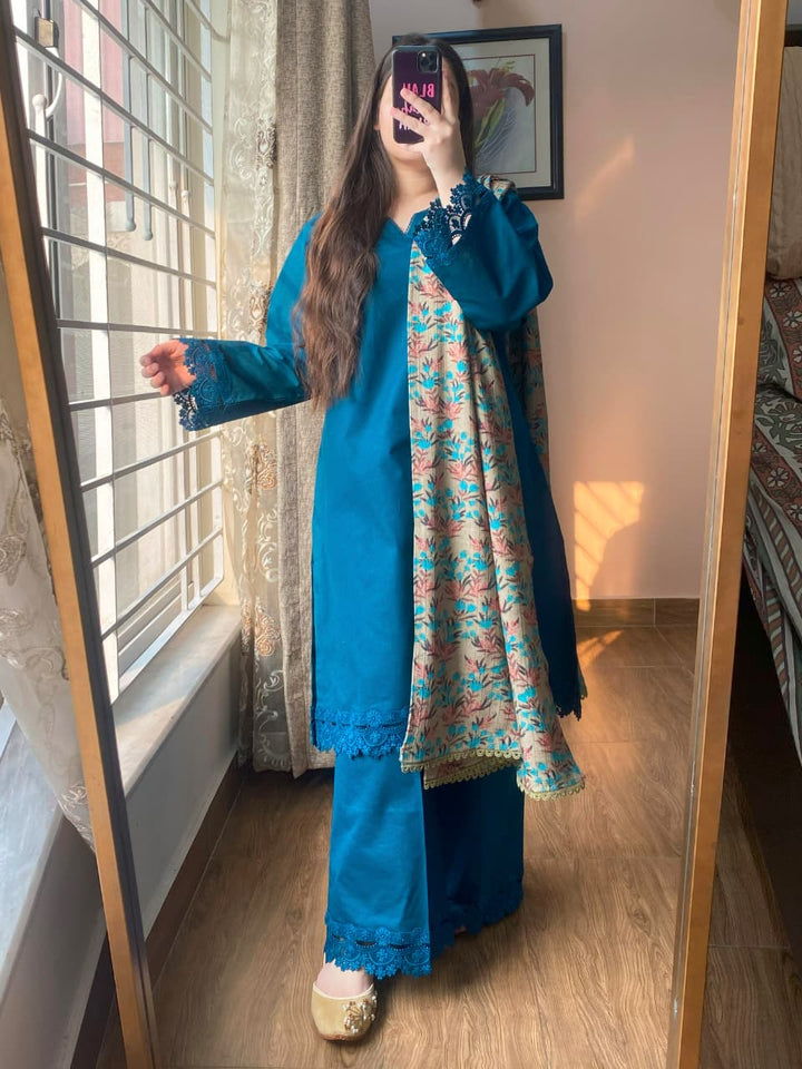 A graceful blend of winter comfort and elevated design, this 3-piece Dobby Khaddar suit is crafted to bring elegance to your seasonal wardrobe. With intricate lacework and refined tailoring, this ensemble is ideal for both casual sophistication and intimate gatherings.