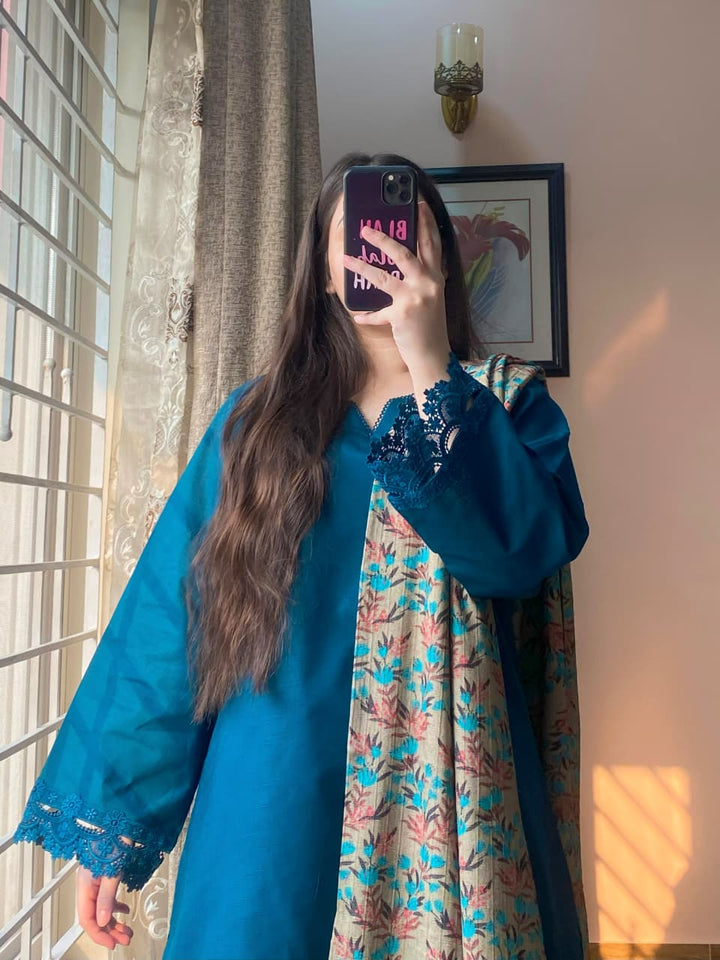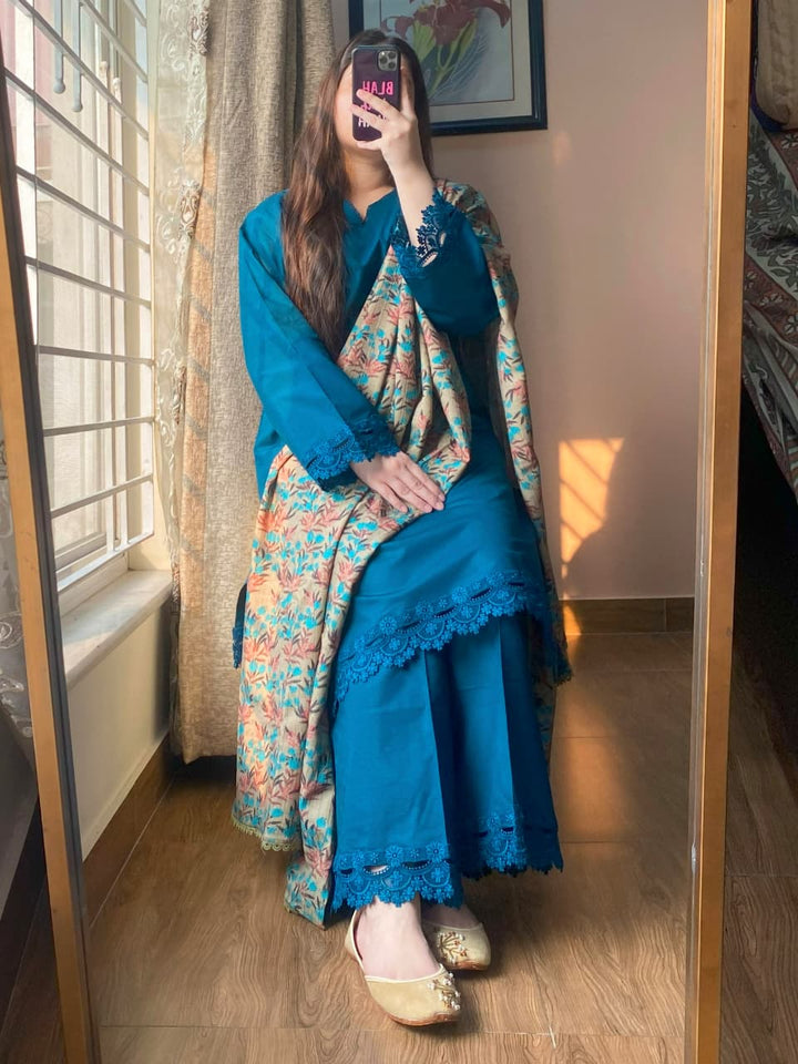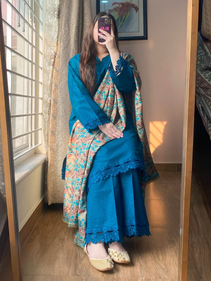 Shawl – The ensemble is completed with a soft printed Dhanak shawl that adds warmth and seasonal elegance. Two corners are delicately finished with lace, providing a graceful accent to the overall design.