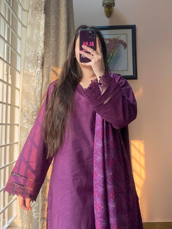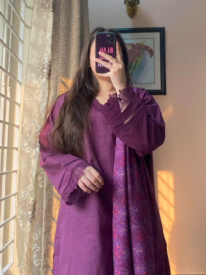 A graceful blend of winter comfort and elevated design, this 3-piece Dobby Khaddar suit is crafted to bring elegance to your seasonal wardrobe. With intricate lacework and refined tailoring, this ensemble is ideal for both casual sophistication and intimate gatherings.