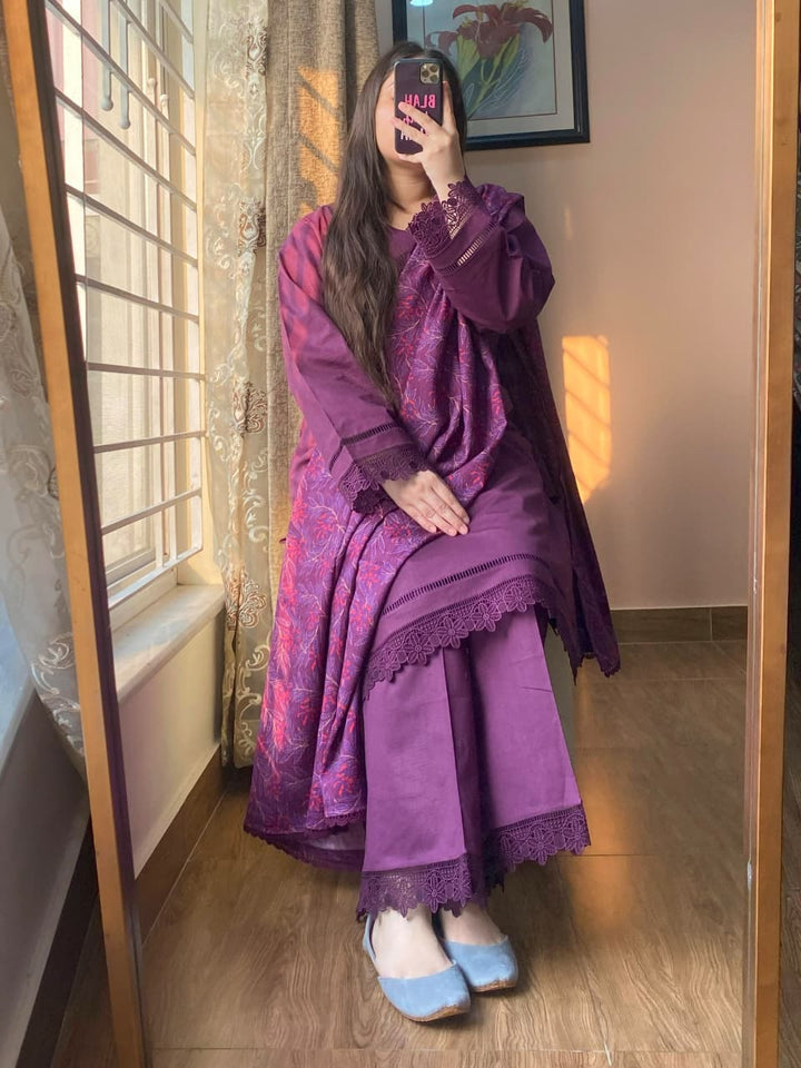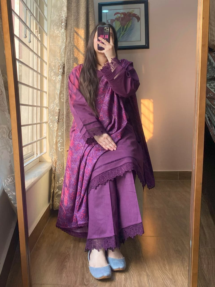 Shawl – The ensemble is completed with a soft printed Dhanak shawl that adds warmth and seasonal elegance. Two corners are delicately finished with lace, providing a graceful accent to the overall design.