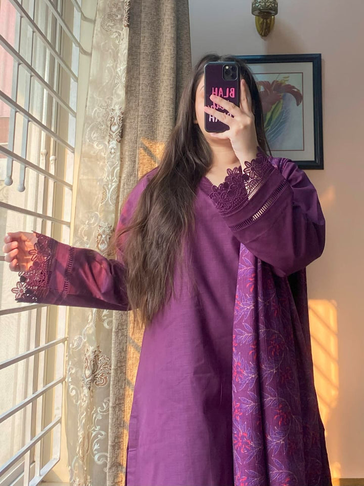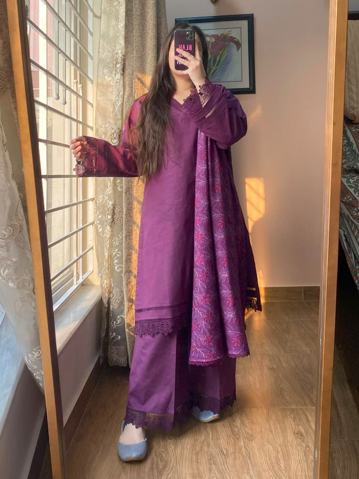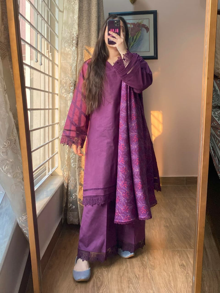 Plazo – Complementing the shirt is a straight-cut plazo, tailored from Dobby Khaddar. The hem is beautifully enhanced with matching lace, giving the outfit a balanced and polished look while maintaining comfort.
