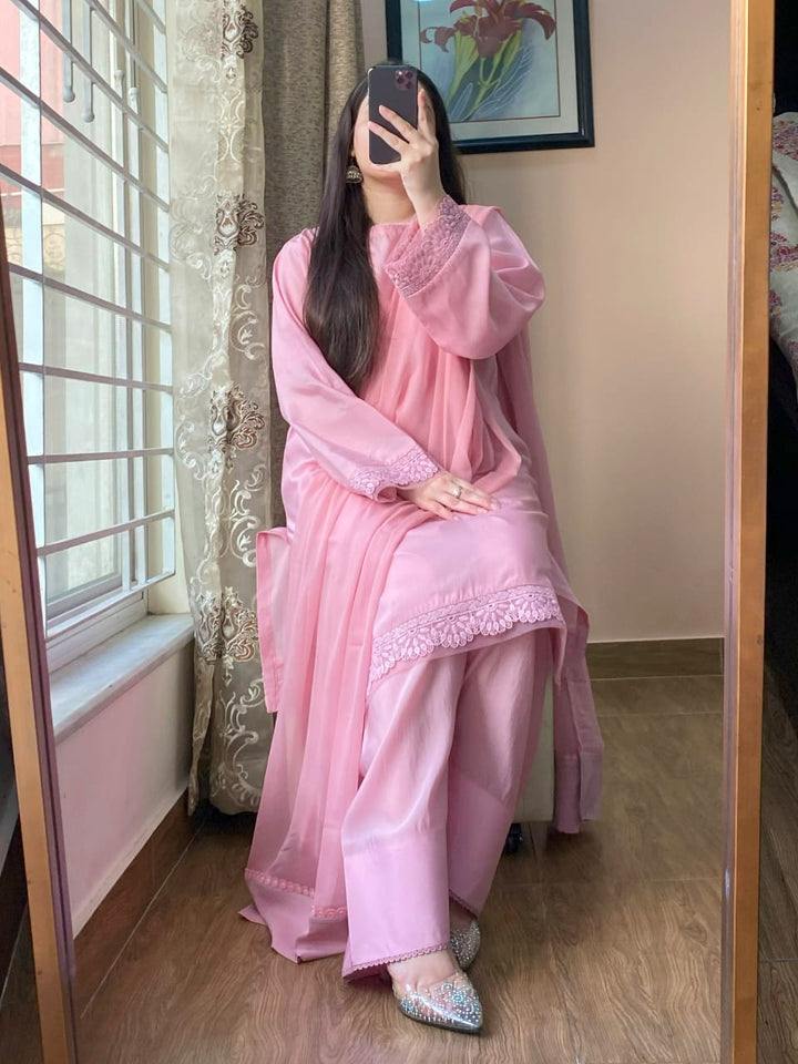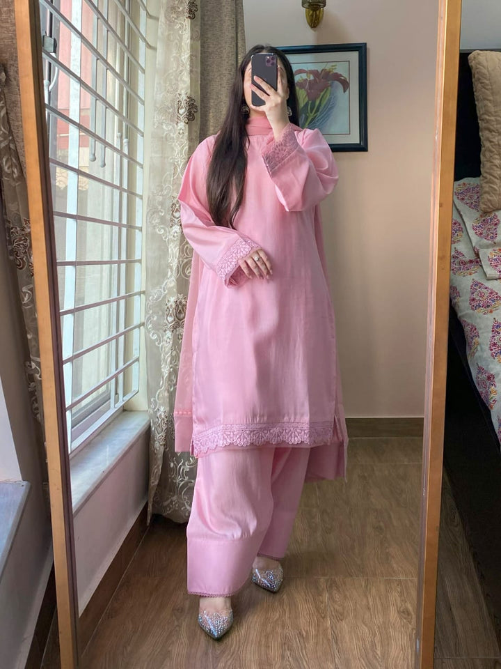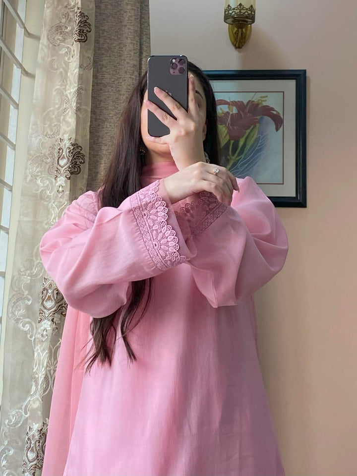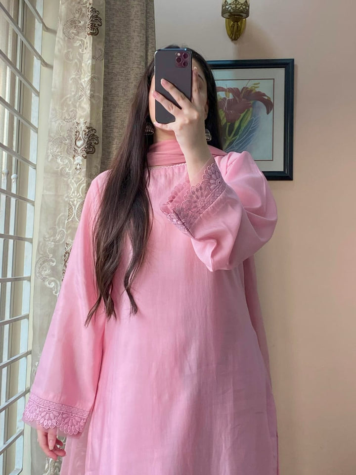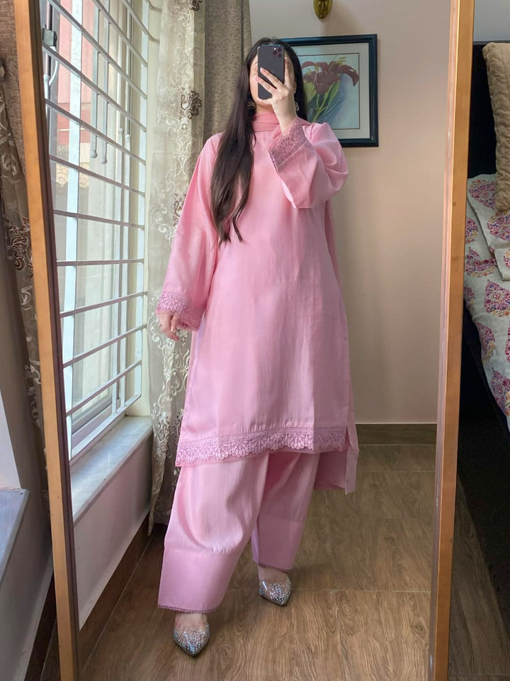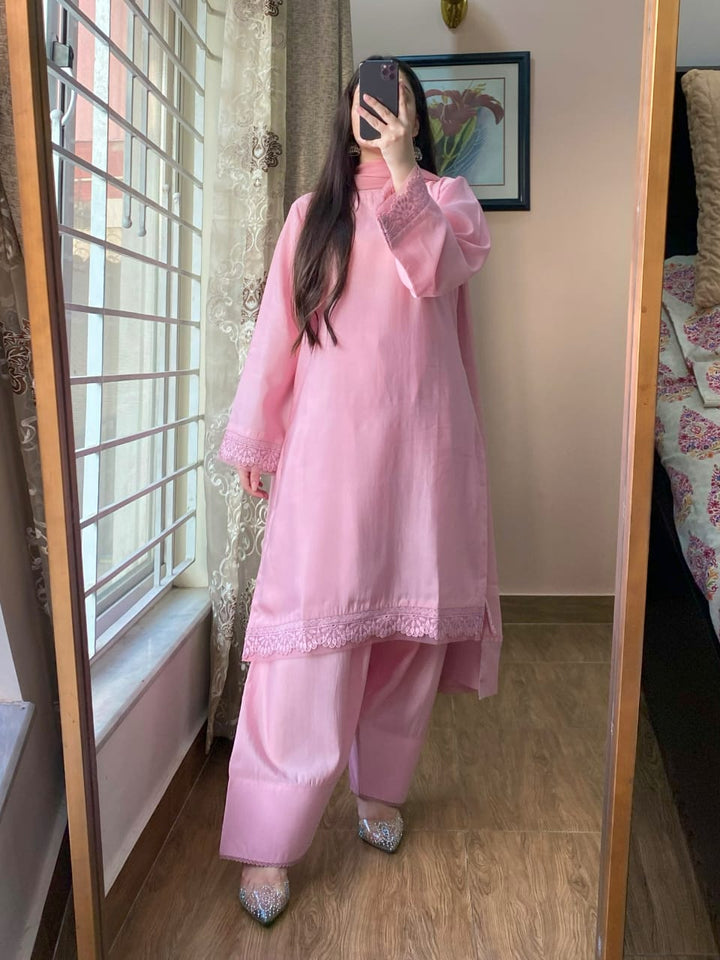 - Dupatta: Lightweight chiffon dupatta with lace on two corners, offering a soft, flowy drape.