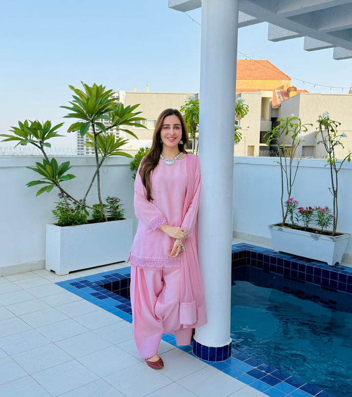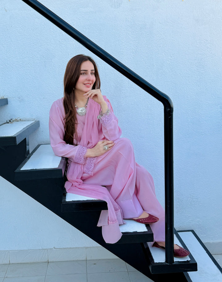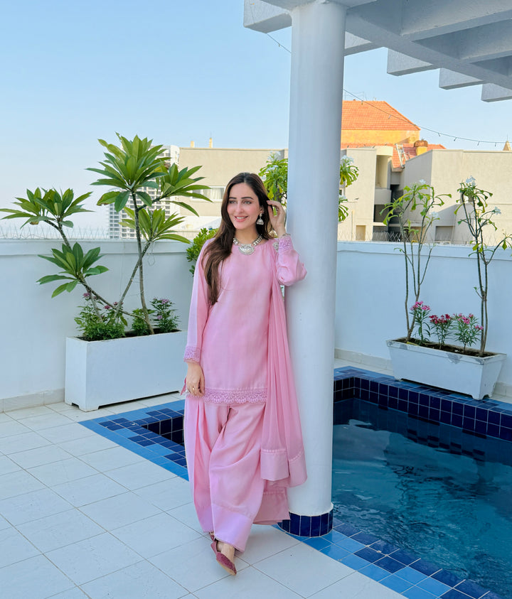 - Shirt: Made from high-quality georgette, features a round neckline adorned with a fine lace, while the sleeves and hem (daman) are accentuated with net detailing and lace for a graceful finish.
