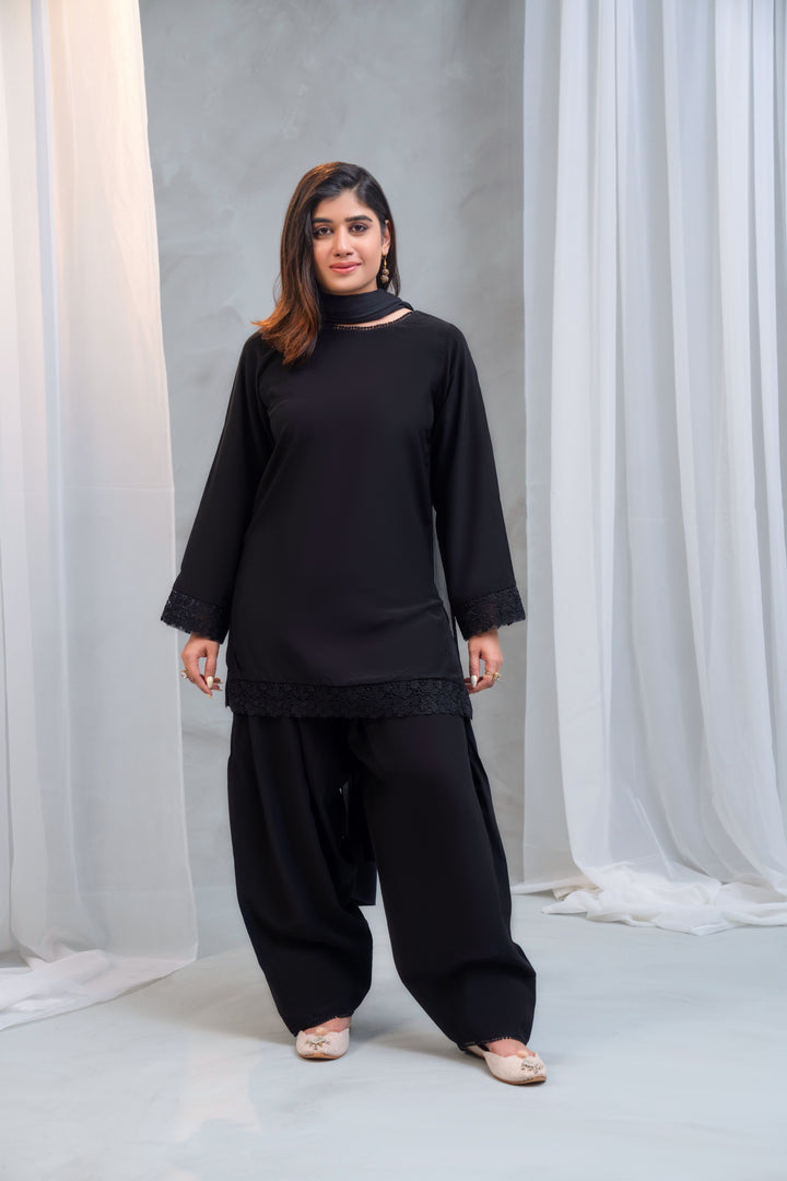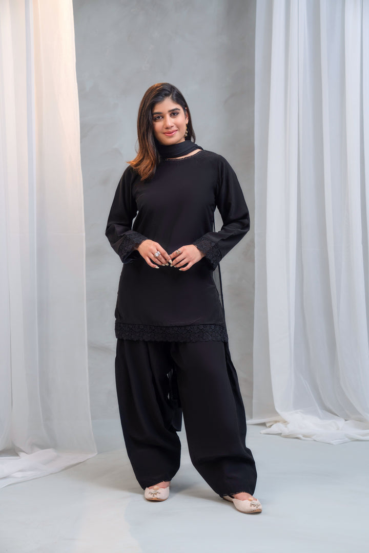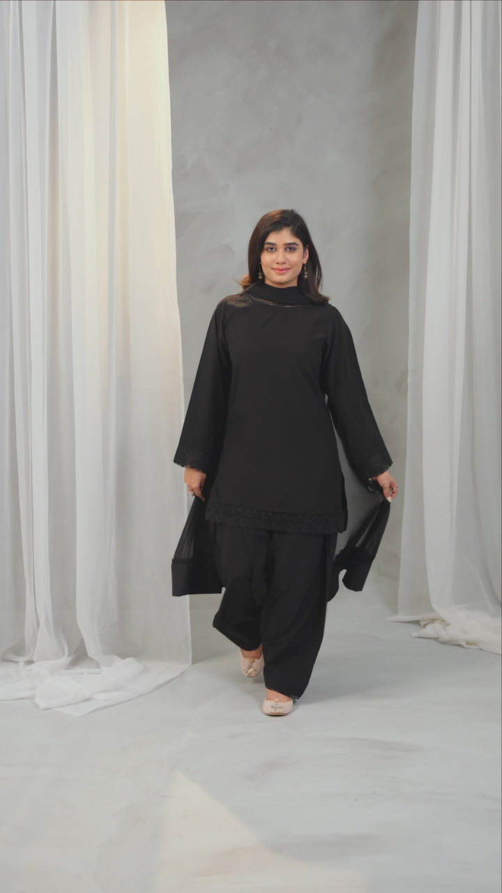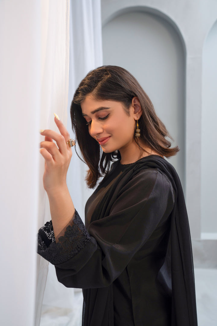 - Dupatta: Lightweight chiffon dupatta with lace on two corners, offering a soft, flowy drape.