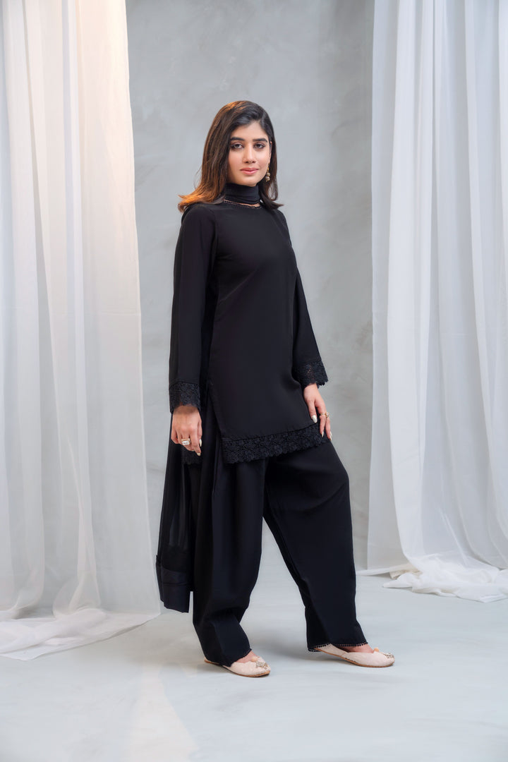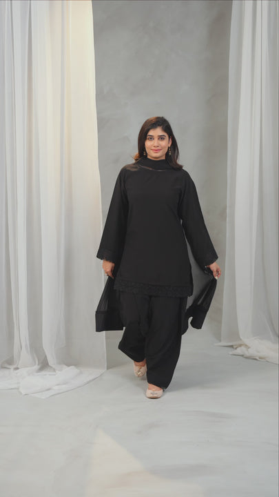 - Shirt: Made from high-quality georgette, features a round neckline adorned with a fine lace, while the sleeves and hem (daman) are accentuated with net detailing and lace for a graceful finish.