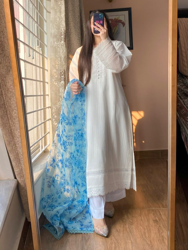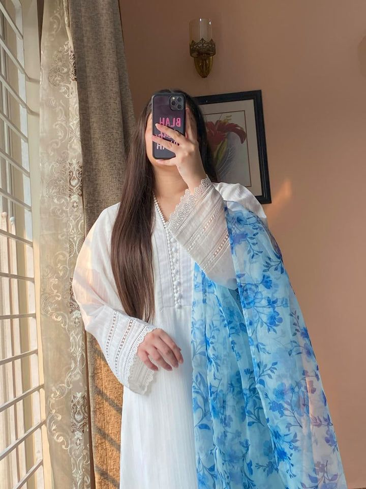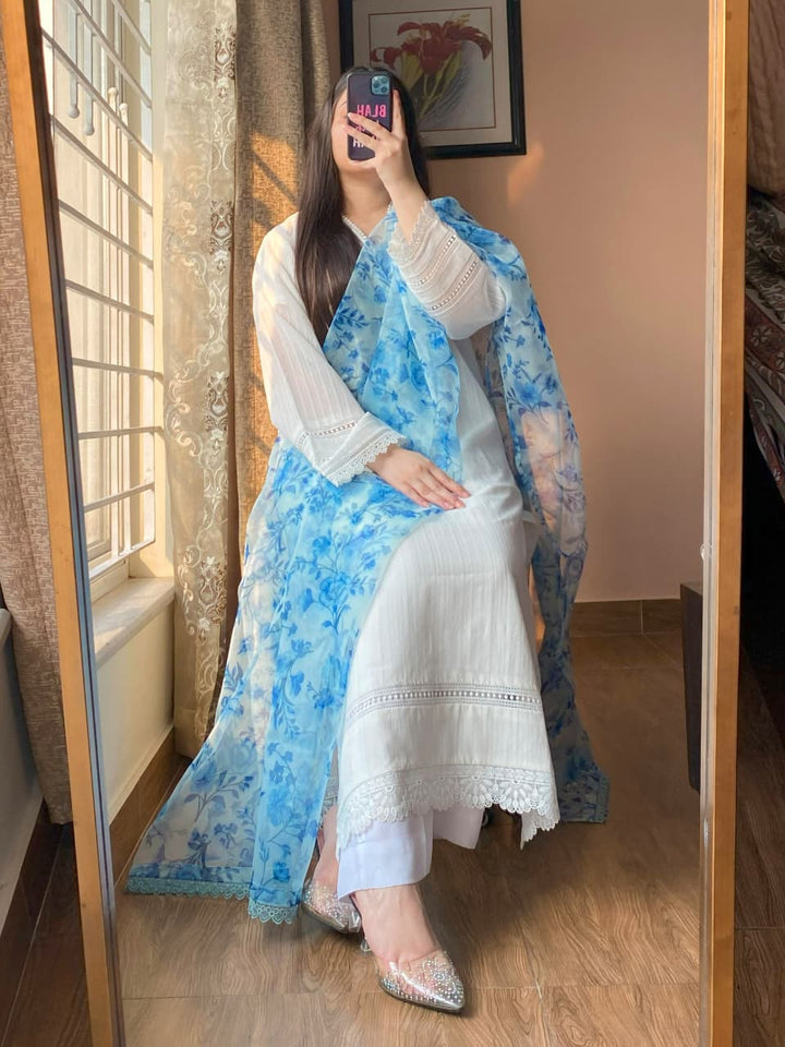 Dupatta: Made from soft, lightweight organza, the dupatta features subtle lace embellishments on two corners, providing a graceful drape that completes the outfit with understated elegance.