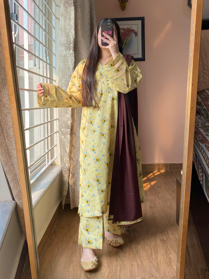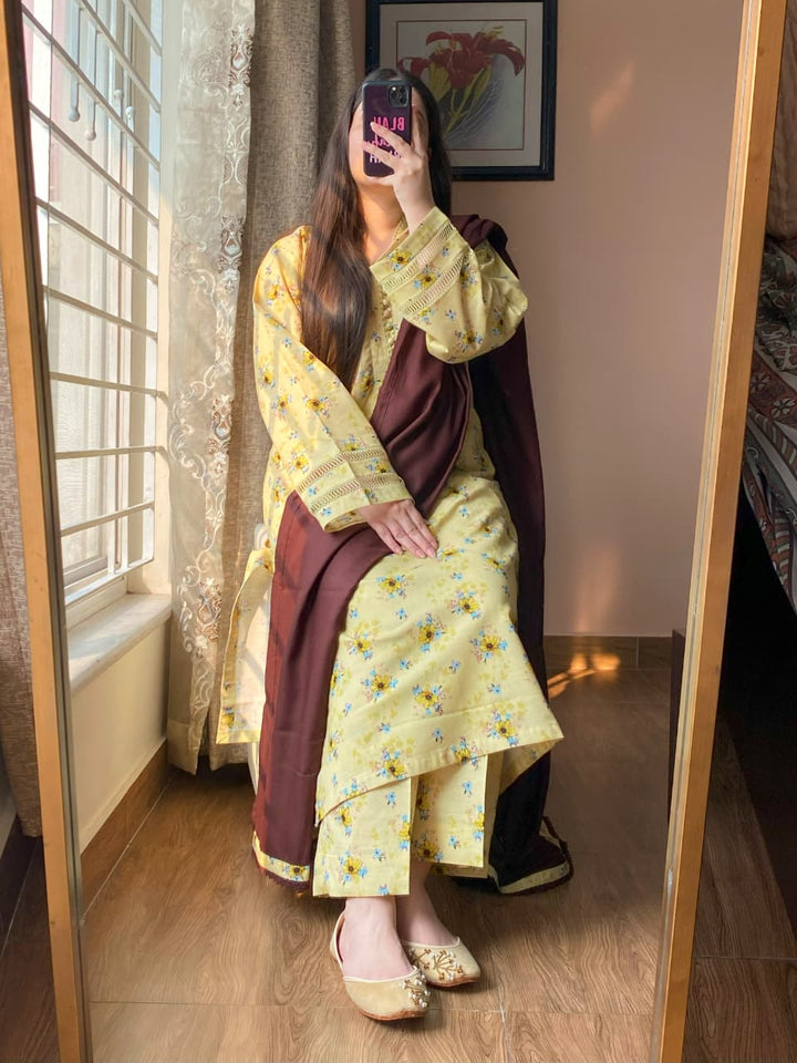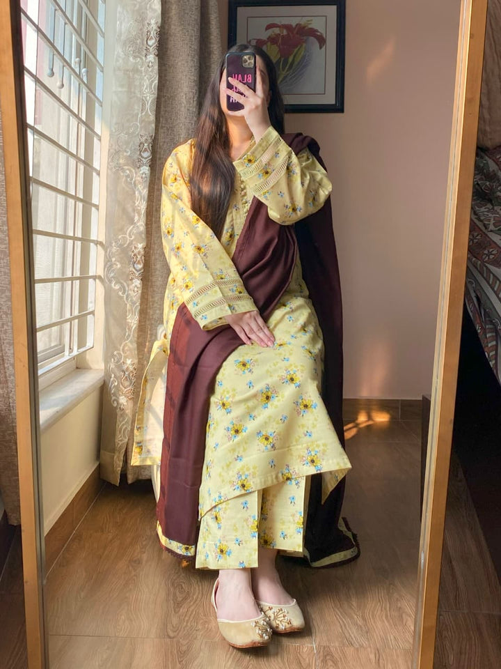 A timeless blend of comfort and elegance, this 3-piece printed Slub Khaddar suit features intricate lace detailing and a warm Dhanak shawl — perfect for refined winter styling.