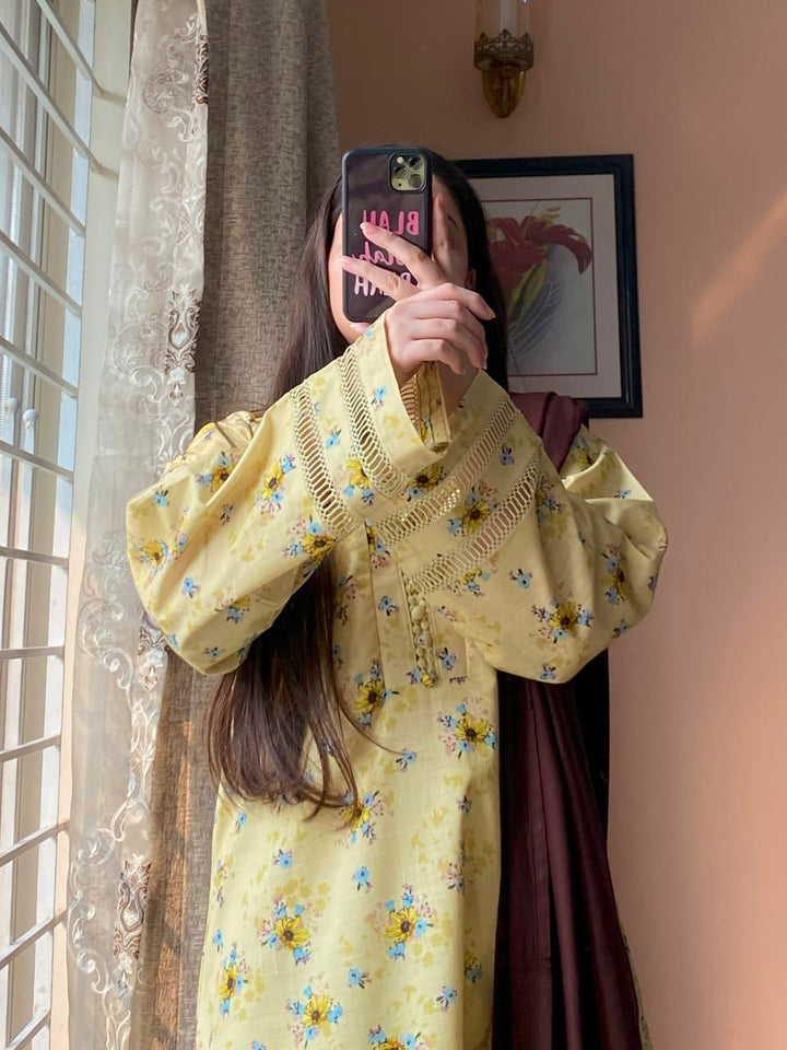 - Shirt – Premium Slub Khaddar printed shirt, beautifully detailed with intricate lacework on the sleeves and neckline, giving it a polished and graceful appearance. The neckline features delicate buttons and fine lace, while joint lace detailing on the sleeves adds a stylish and refined touch to the overall design.