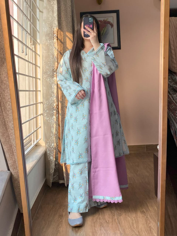 - Shirt – Crafted from high-quality Printed Slub Khaddar, the shirt features a round neckline with a front slit, delicately adorned with fine lace for an elegant finish. The sleeves are detailed with subtle, narrow lace, while the hemline (daman) also features the same refined lacework—bringing continuity and charm to the overall design.