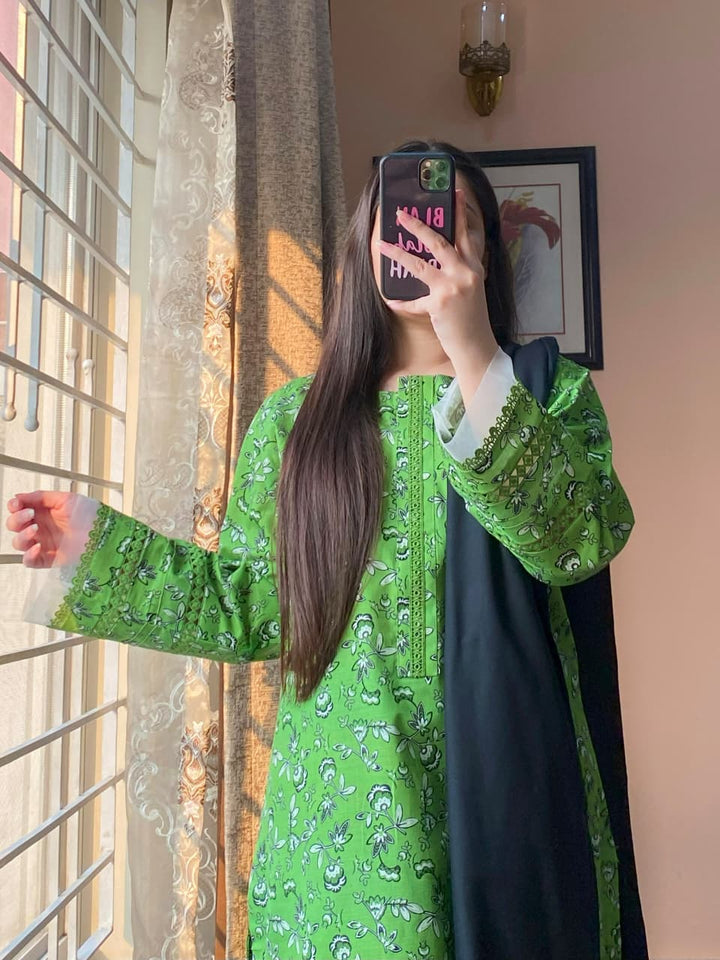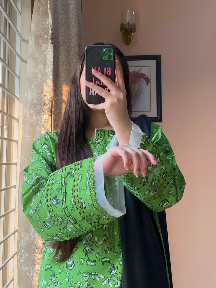 - Shirt – Premium Slub Khaddar printed shirt, beautifully detailed with intricate lacework on the sleeves and neckline, giving it a polished and graceful appearance. The neckline features fine lace, while joint lace and tissue detailing on the sleeves adds a stylish and refined touch to the overall design.