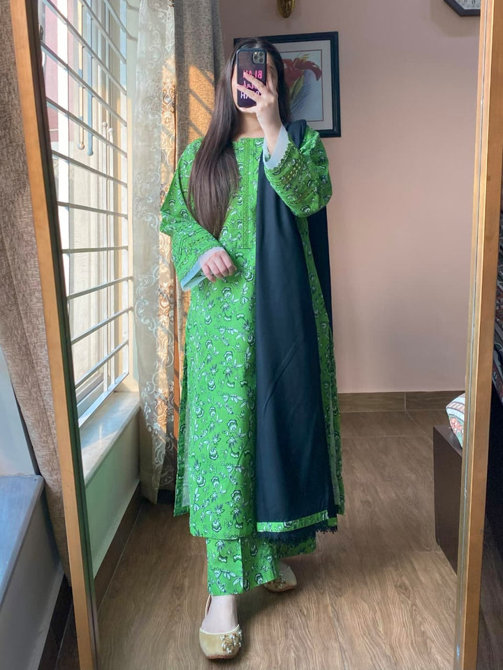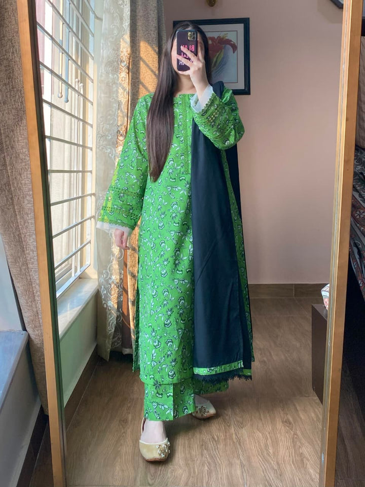 A timeless blend of comfort and elegance, this 3-piece printed Slub Khaddar suit features intricate lace detailing and a warm Dhanak shawl — perfect for refined winter styling.