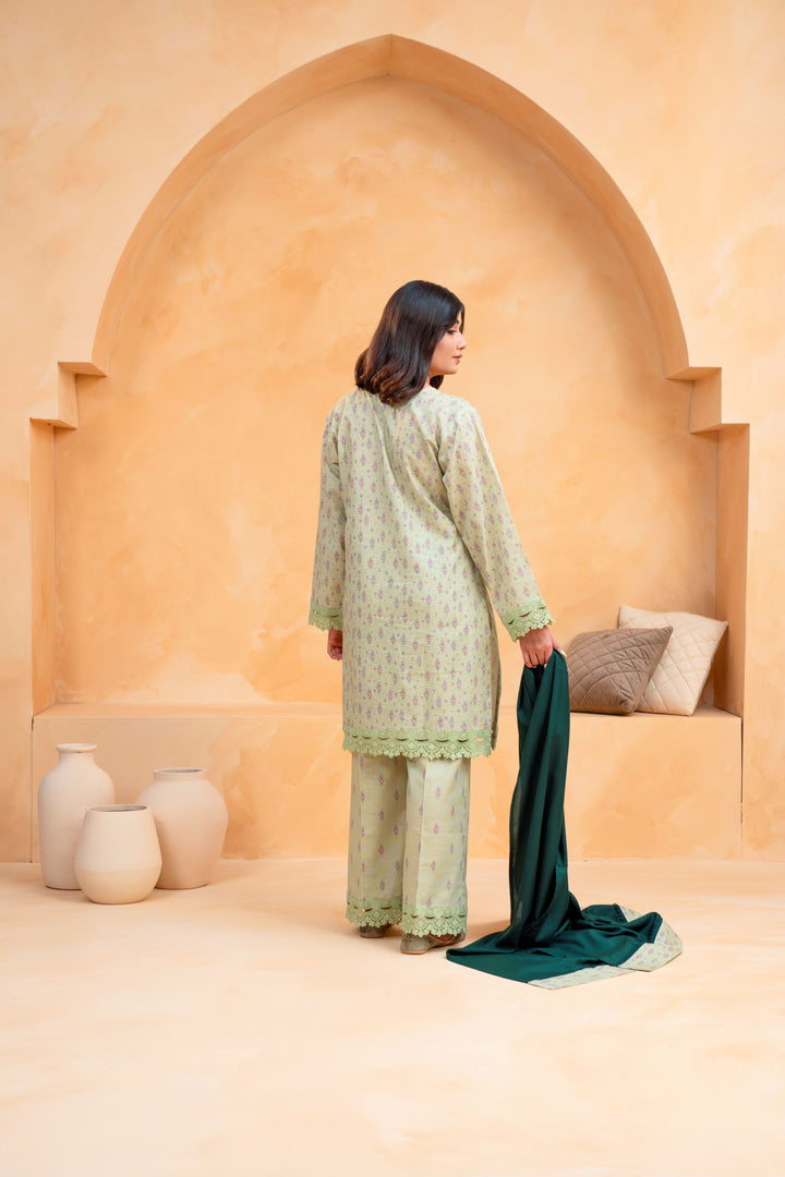 - Shirt – Made from premium printed Slub Khaddar, the shirt features a round neckline adorned with delicate buttons for a touch of classic charm. The sleeves are enhanced with broad lace detailing, while the daman is finished with a wide lace border, adding depth and festive allure to the design.