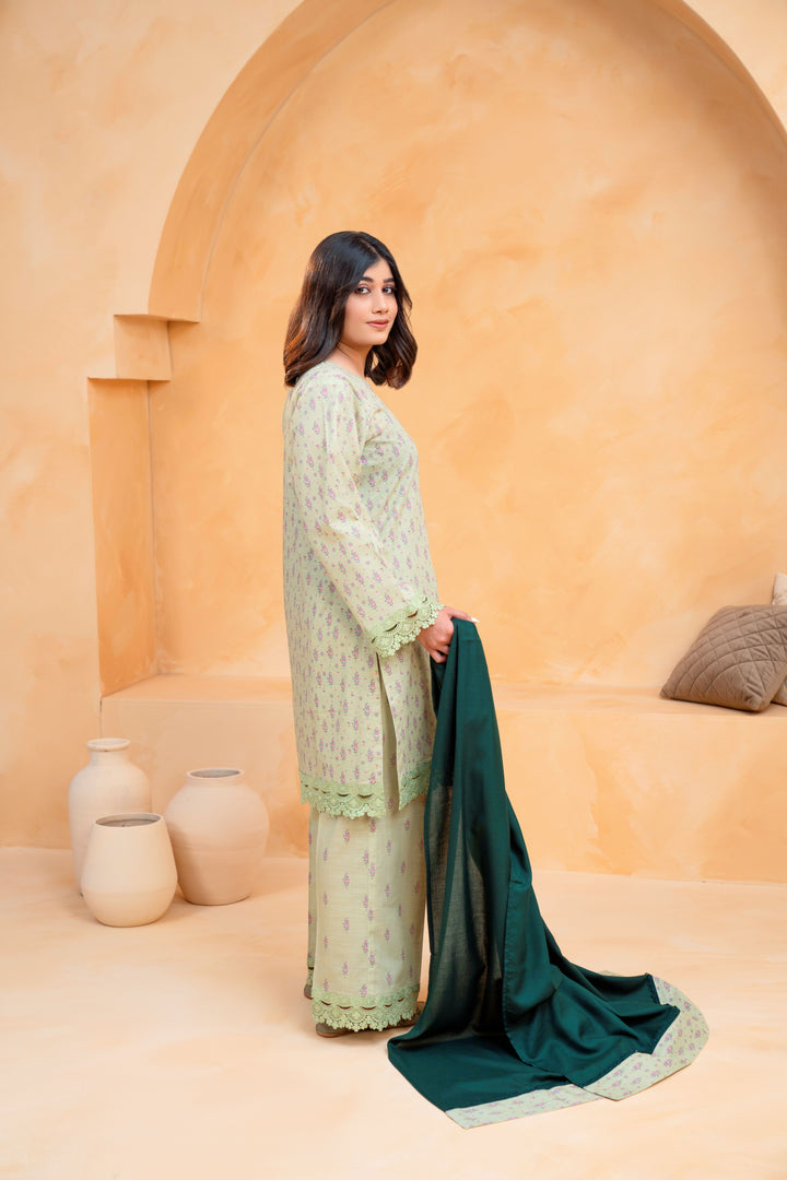 3-PIECE PREMIUM SLUB KHADDAR PRINTED STITCHED SUIT WITH PLAZO