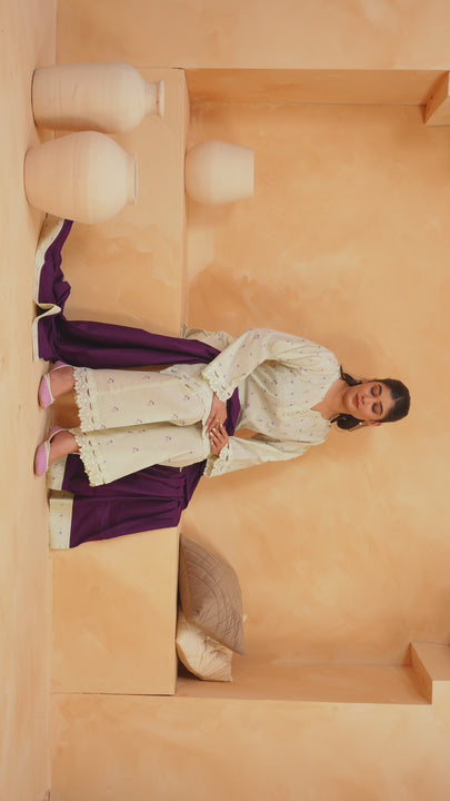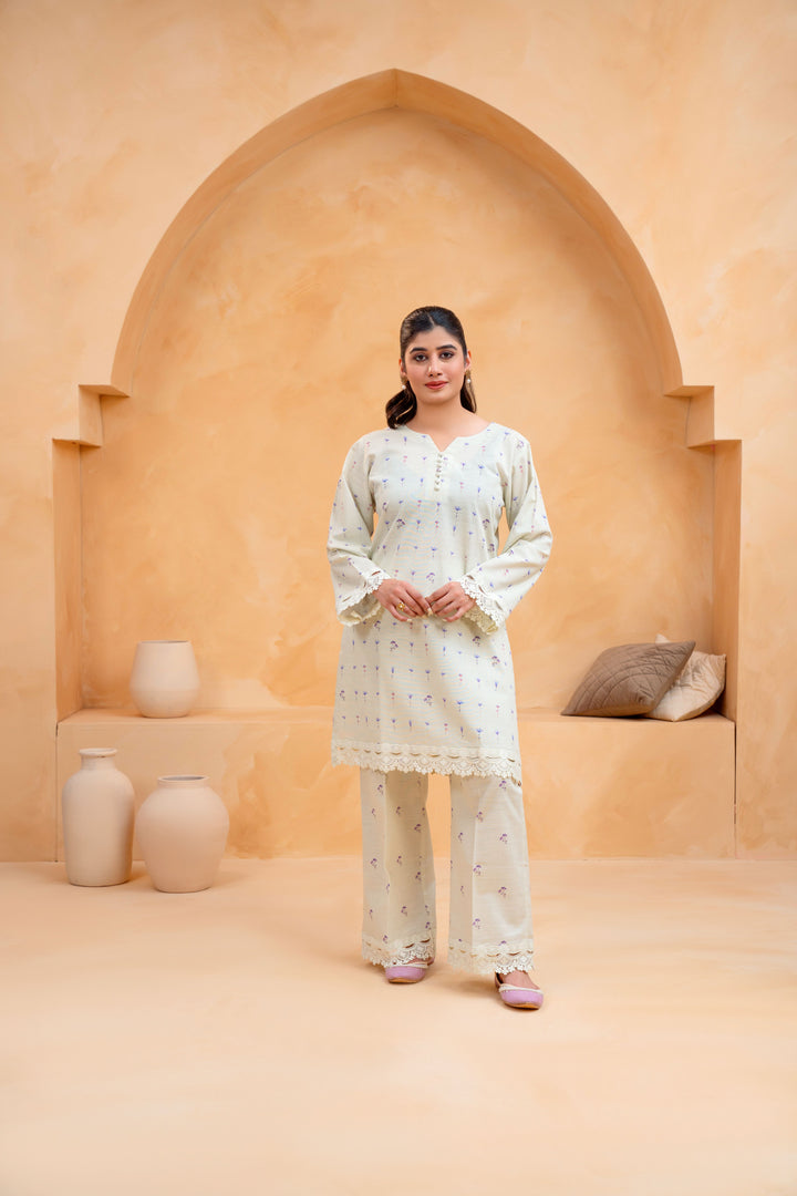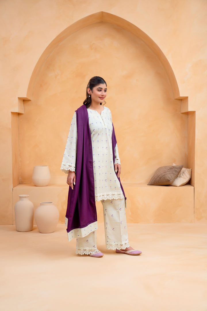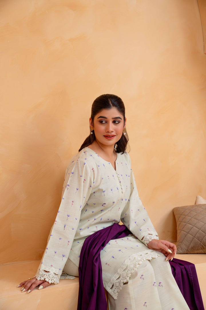 - Plazo – The printed Slub Khaddar plazo is tailored for comfort and modern appeal, beautifully detailed with a broad lace trim at the hem to create a cohesive, elegant look.