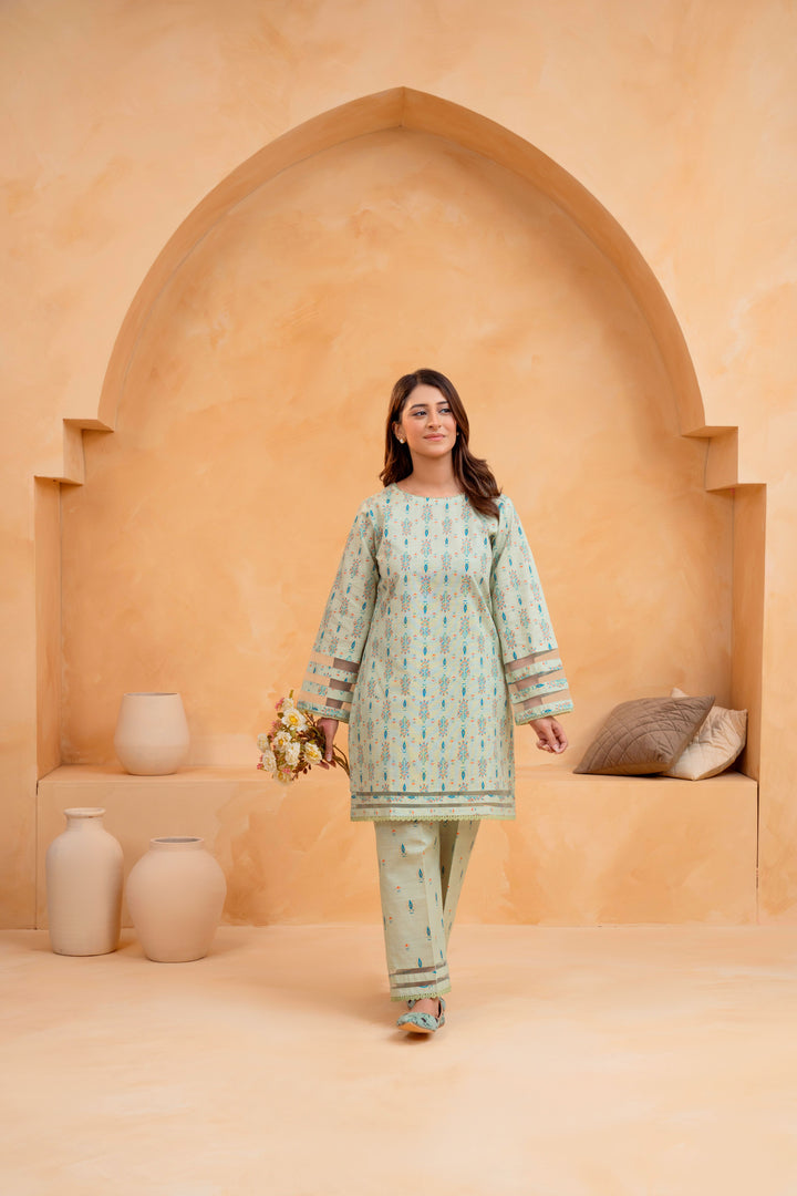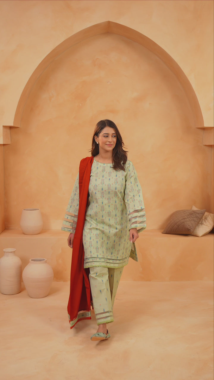 - Shirt – Premium Slub Khaddar printed shirt with a round neckline adorned with fine lace detailing, creating an elegant finish. The sleeves feature net patches enhanced with delicate lace on the edges, while the daman is beautifully designed with net panels and lace along the hem, adding texture and charm to the outfit.