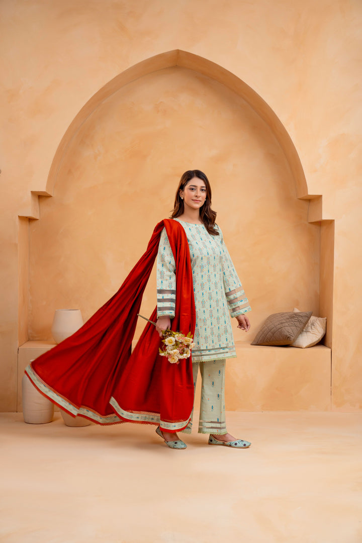A graceful fusion of warmth, style, and sophistication — this 3-piece Slub Khaddar Printed Suit is crafted for the perfect winter look, featuring delicate lace and net detailing paired with a cozy Marina shawl for a refined seasonal statement.