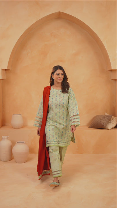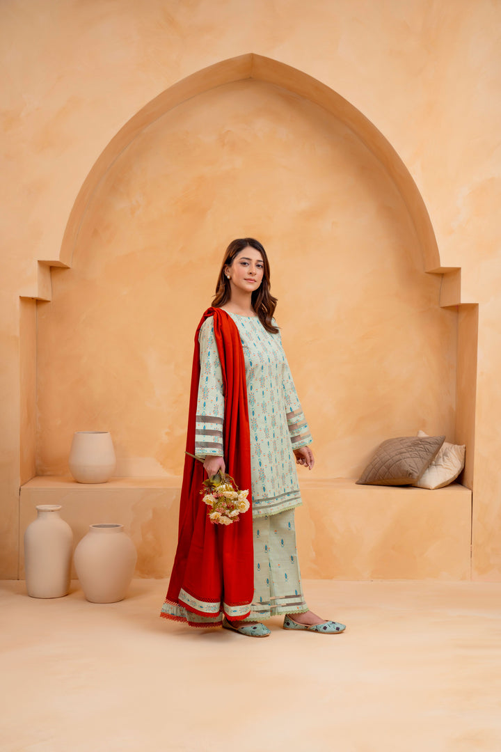 3-PIECE SLUB KHADDAR PRINTED STITCHED SUIT WITH MARINA SHAWL