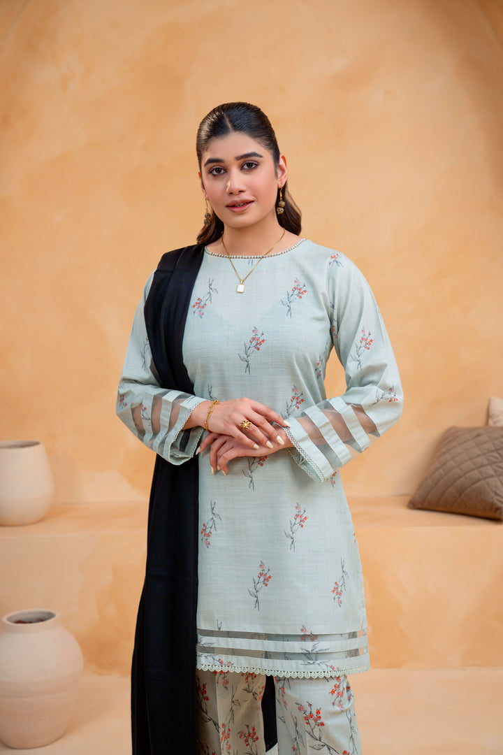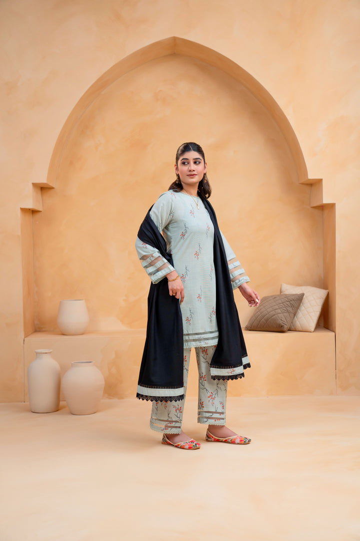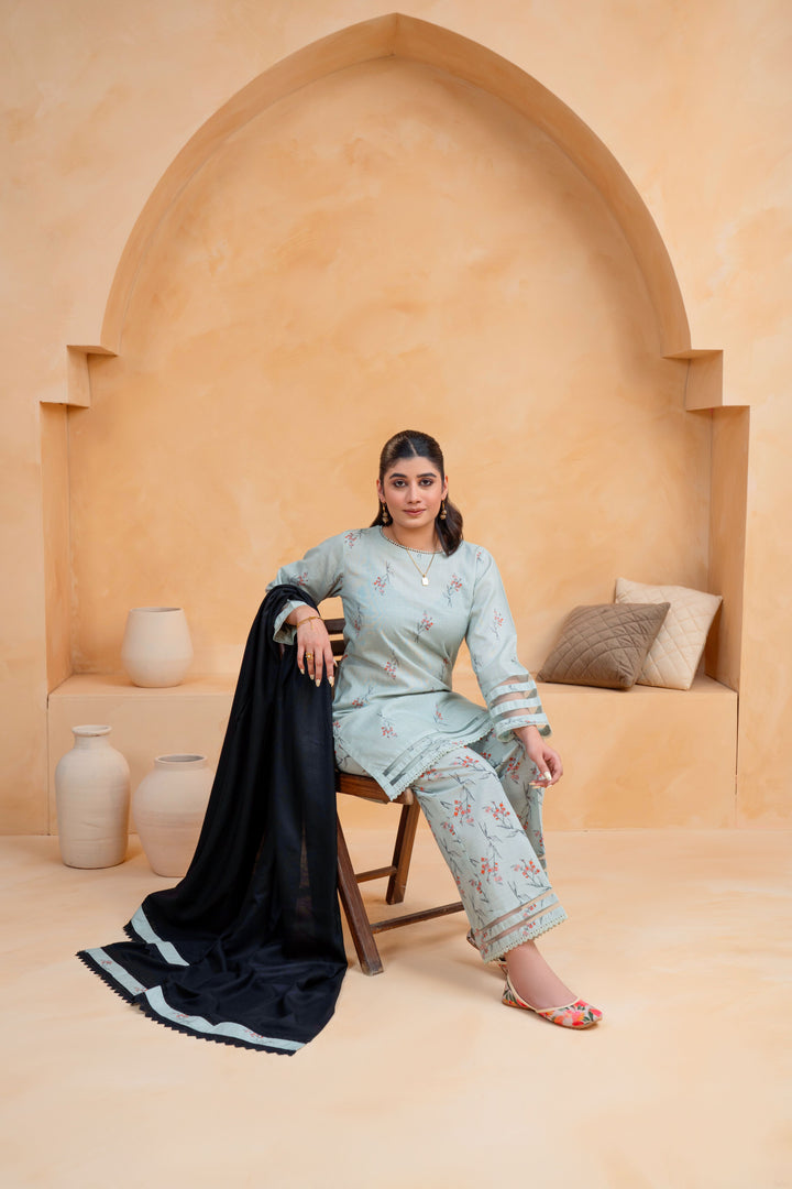 A graceful fusion of warmth, style, and sophistication — this 3-piece Slub Khaddar Printed Suit is crafted for the perfect winter look, featuring delicate lace and net detailing paired with a cozy Dhanak shawl for a refined seasonal statement.