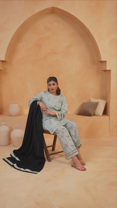 A graceful fusion of warmth, style, and sophistication — this 3-piece Slub Khaddar Printed Suit is crafted for the perfect winter look, featuring delicate lace and net detailing paired with a cozy Marina shawl for a refined seasonal statement.