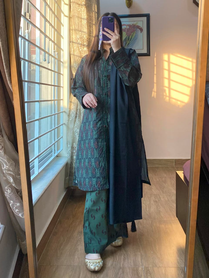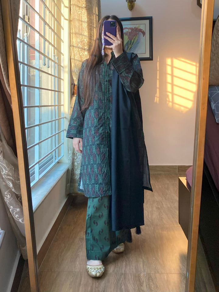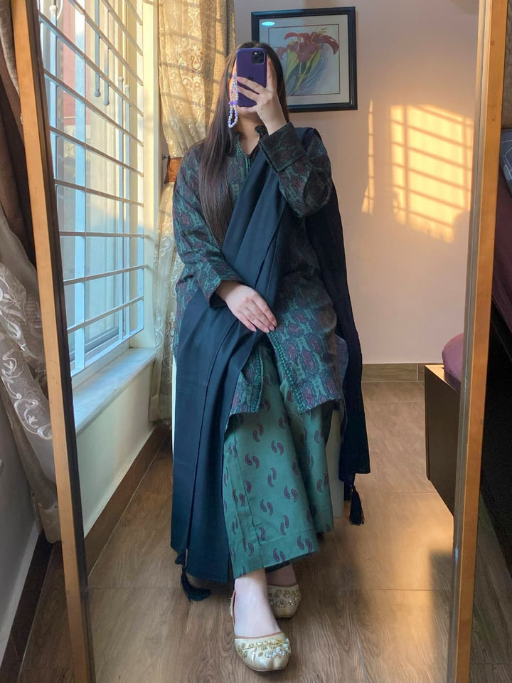 3 Piece - Khaddar Printed Dress with Bell Bottom Trouser