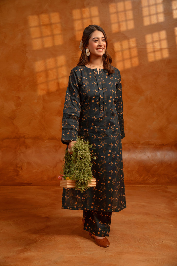Shirt – A beautifully printed Slub Khaddar shirt featuring a classic neckline adorned with delicate lace, adding a refined and graceful touch to the front. The sleeves are elegantly enhanced with matching lace detailing, giving the design a soft and feminine finish.