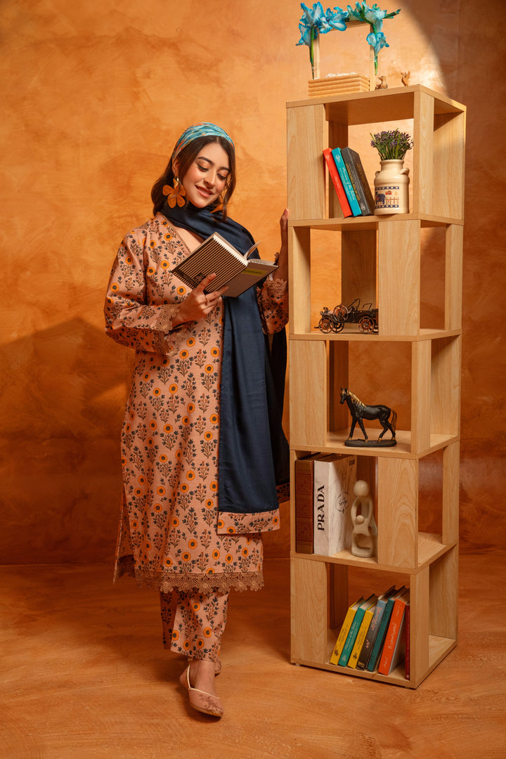3-PIECE SLUB KHADDAR PRINTED STITCHED SUIT WITH MARINA SHAWL