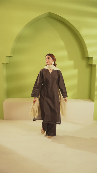 Plazo: Designed for comfort and style, the Slub Khaddar plazo is finished with joint lace at the bottom, complemented by a border at the hem, adding a subtle decorative touch while maintaining a clean silhouette.