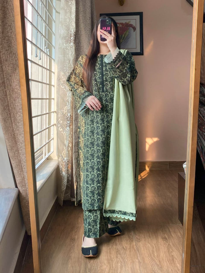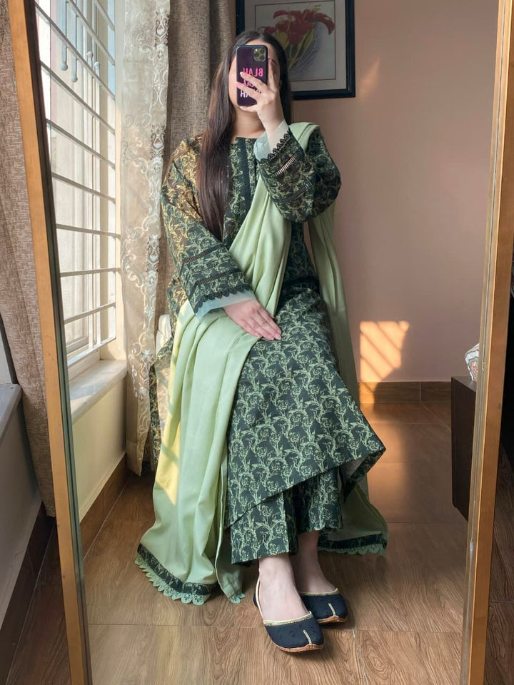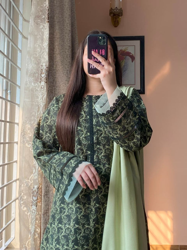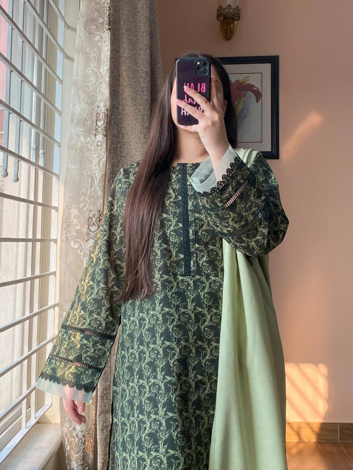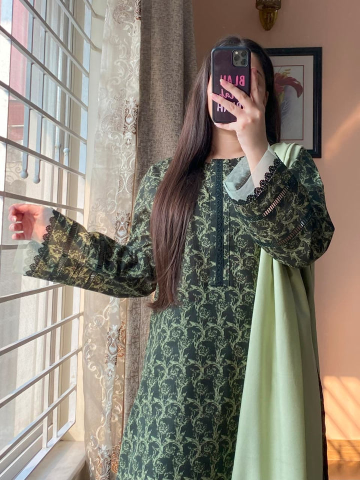A timeless blend of comfort and elegance, this 3-piece printed Slub Khaddar suit features intricate lace detailing and a warm Dhanak shawl — perfect for refined winter styling.