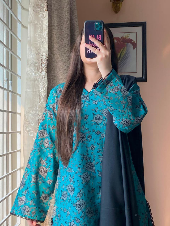 - Shirt – Crafted from high-quality Printed Slub Khaddar, the shirt features a round neckline with a front slit, delicately adorned with fine lace for an elegant finish. The sleeves are detailed with subtle, narrow lace, while the hemline (daman) also features the same refined lacework—bringing continuity and charm to the overall design.
