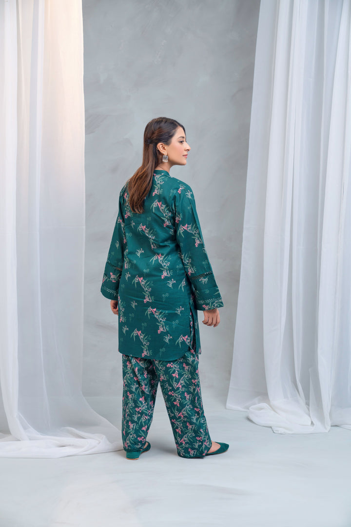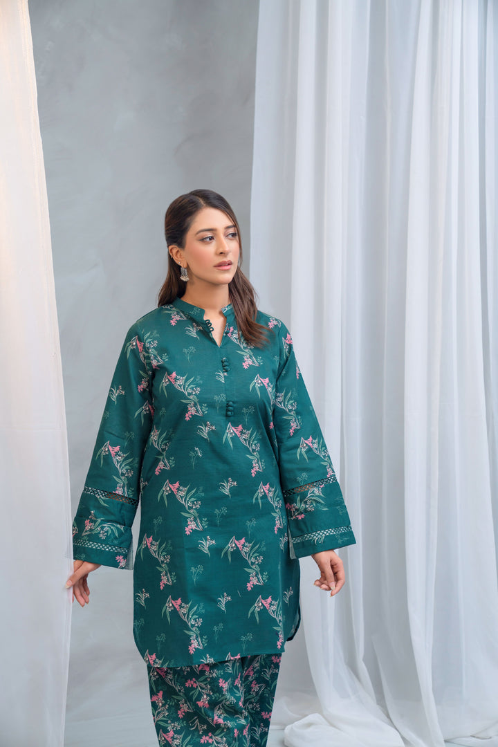 Shirt: Crafted from premium printed Slub Khaddar, the shirt features refined tailoring with a ban-collar neckline adorned with loop buttons, adding a touch of elegance to the overall design. The cut-cuff sleeves are beautifully enhanced with joint lace detailing, blending femininity with sophistication. The rounded hemline adds a graceful finish, while side pockets provide both functionality and style.