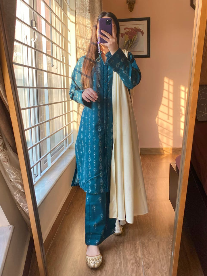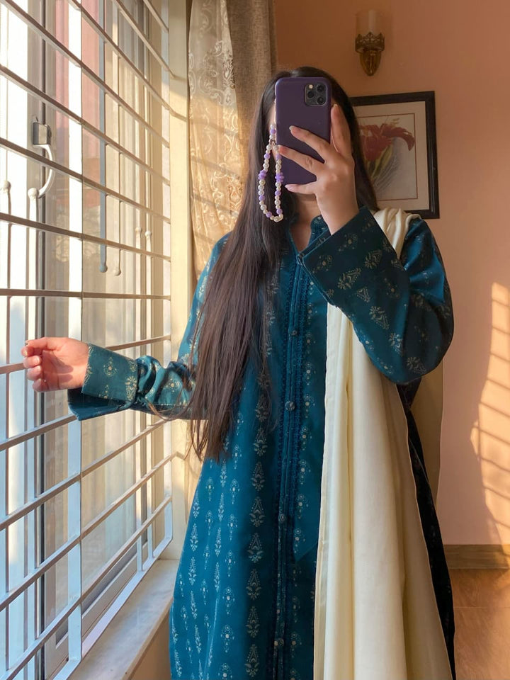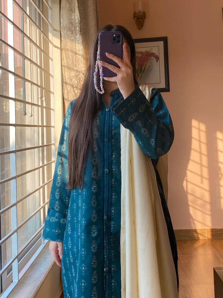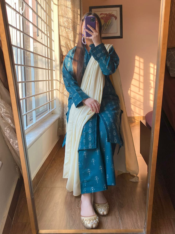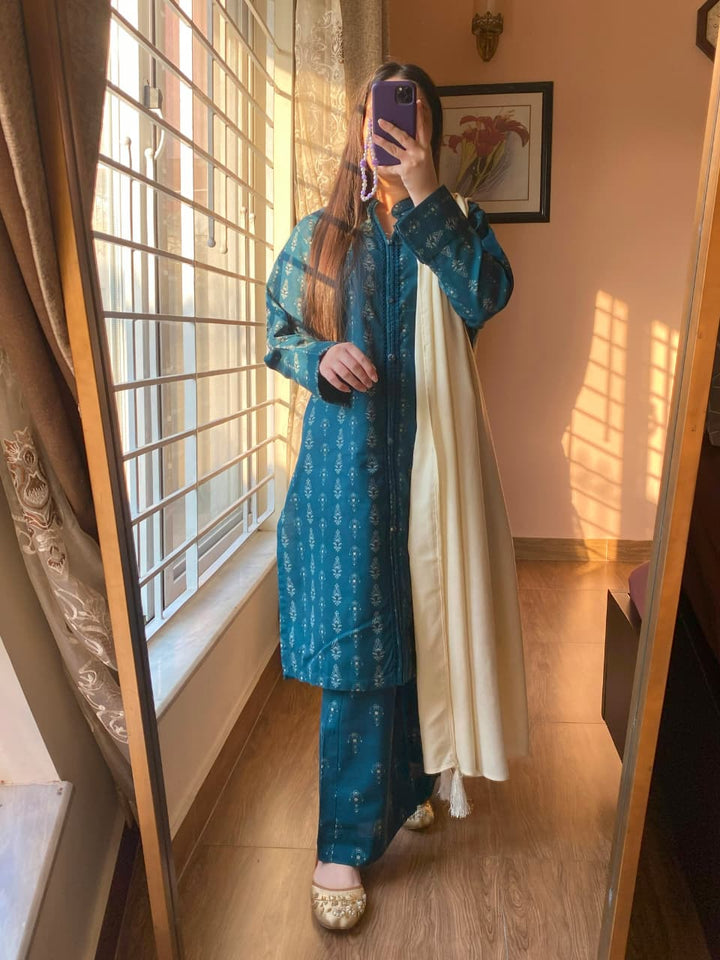 A graceful fusion of warmth, style, and sophistication — this 3-piece Slub Khaddar Printed Suit is crafted to perfection for the winter season. The ensemble features intricate lace detailing, a stylish open-front shirt, and a cozy Dhanak shawl adorned with tassels, creating a refined and modern statement.