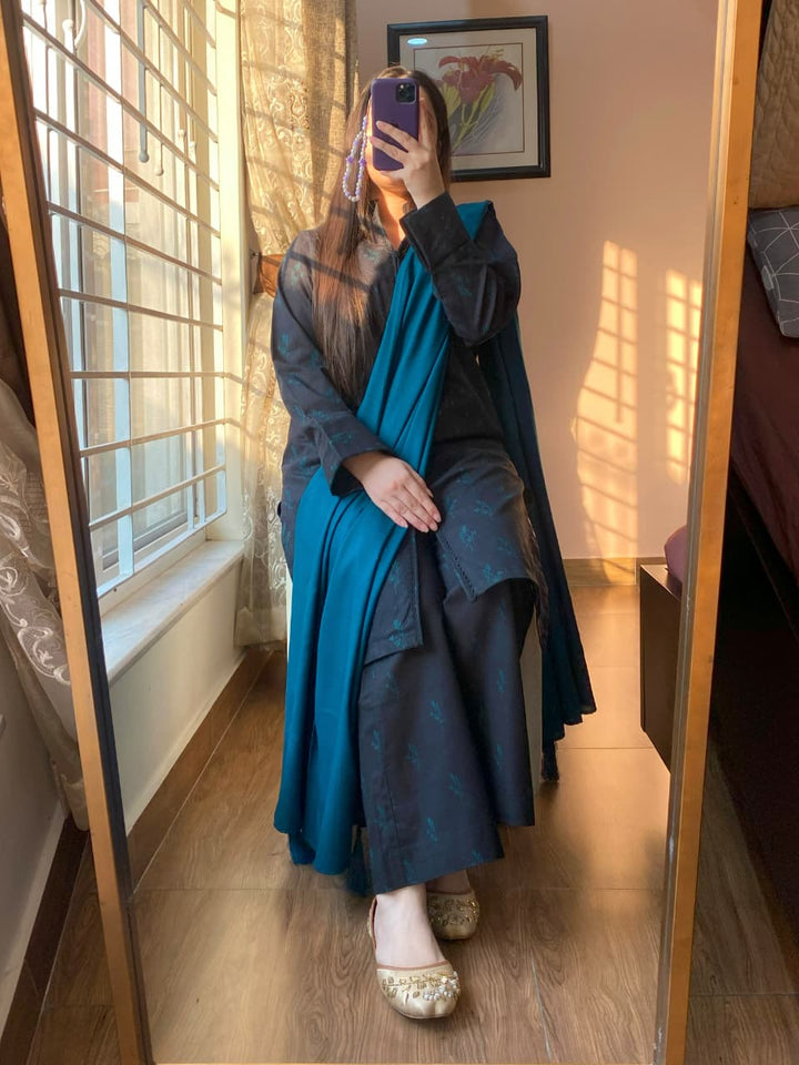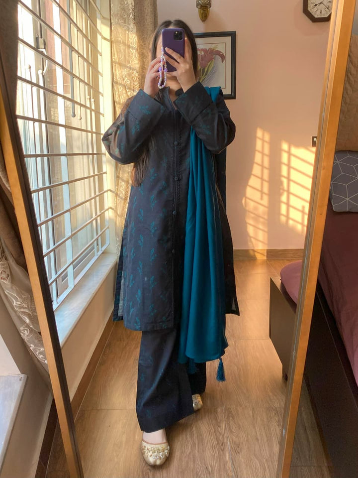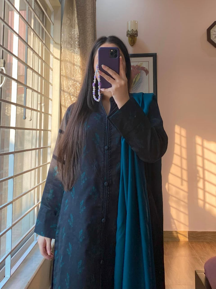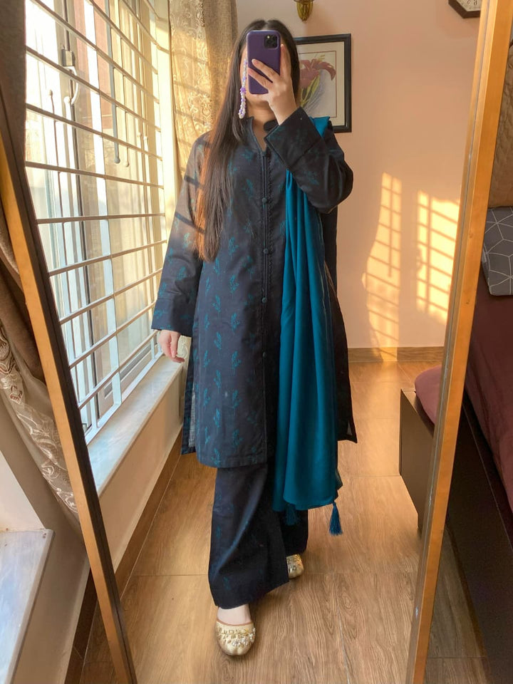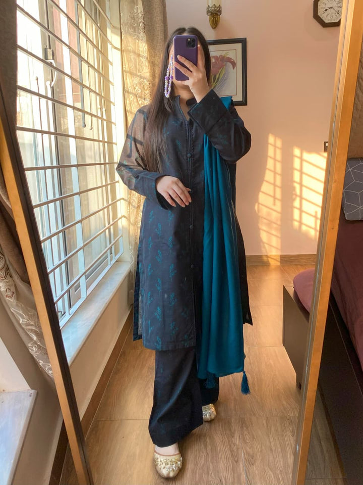 A graceful fusion of warmth, style, and sophistication — this 3-piece Slub Khaddar Printed Suit is crafted to perfection for the winter season. The ensemble features intricate lace detailing, a stylish open-front shirt, and a cozy Dhanak shawl adorned with tassels, creating a refined and modern statement.