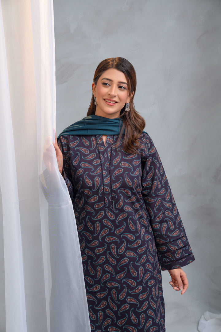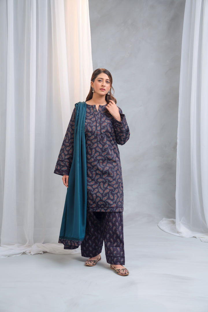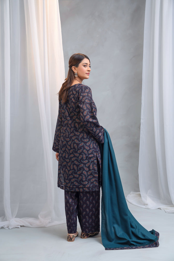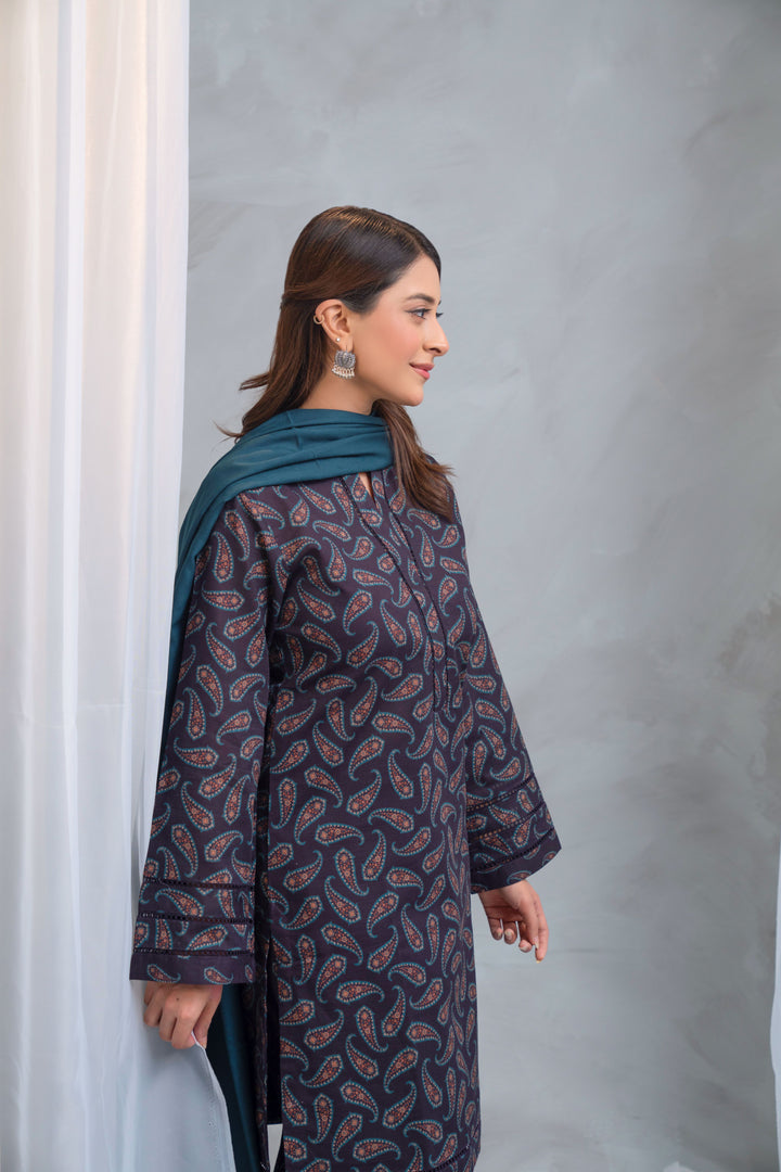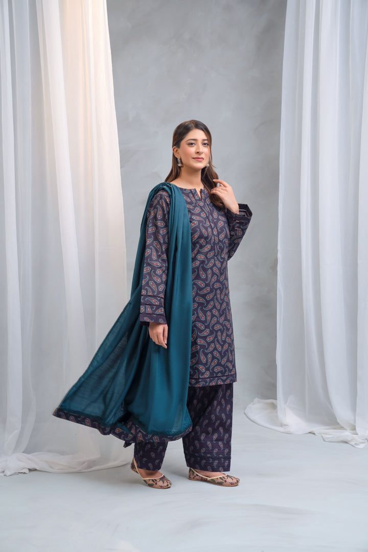 3-PIECE PREMIUM SLUB KHADDAR PRINTED STITCHED SUIT WITH FARSHI SHALWAR