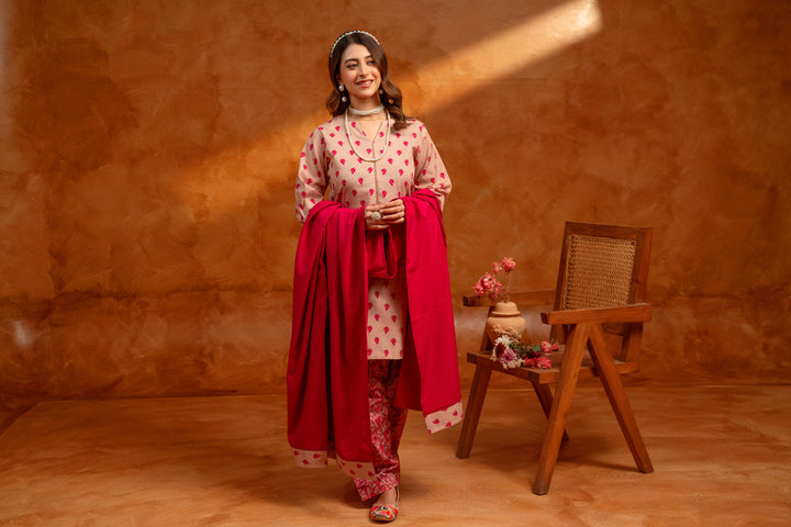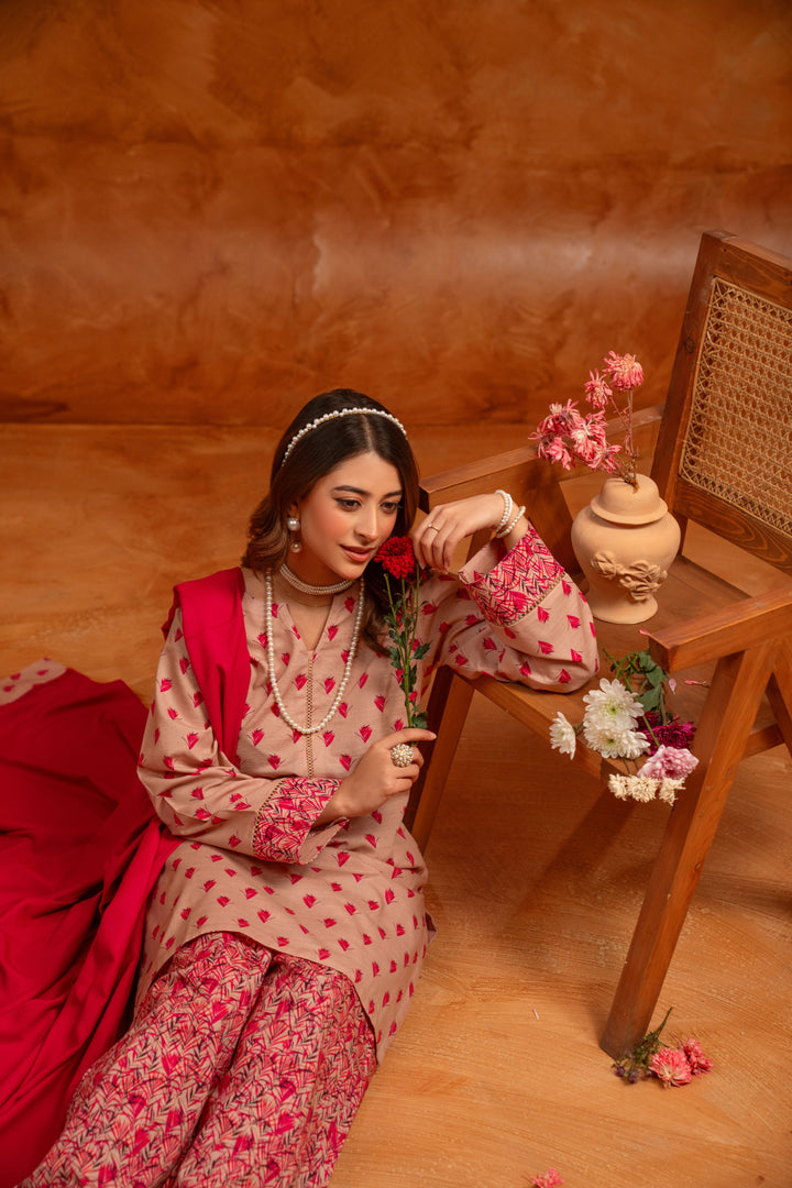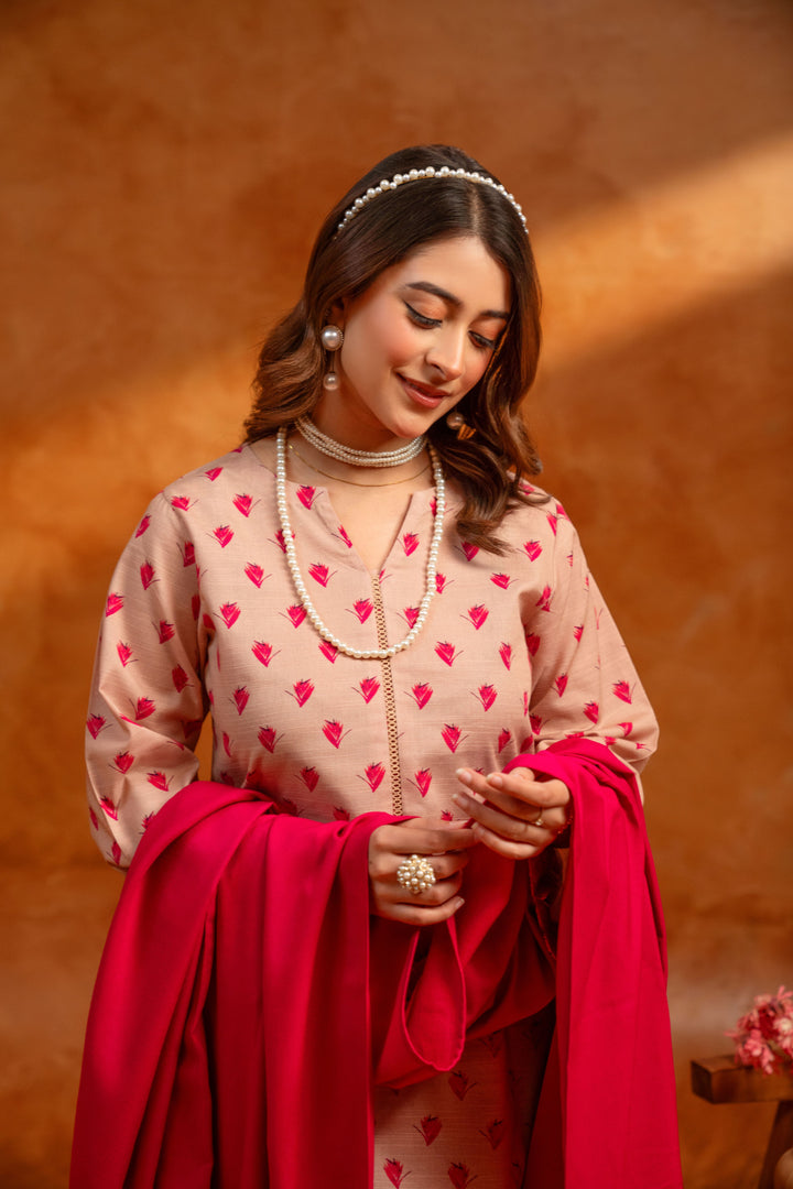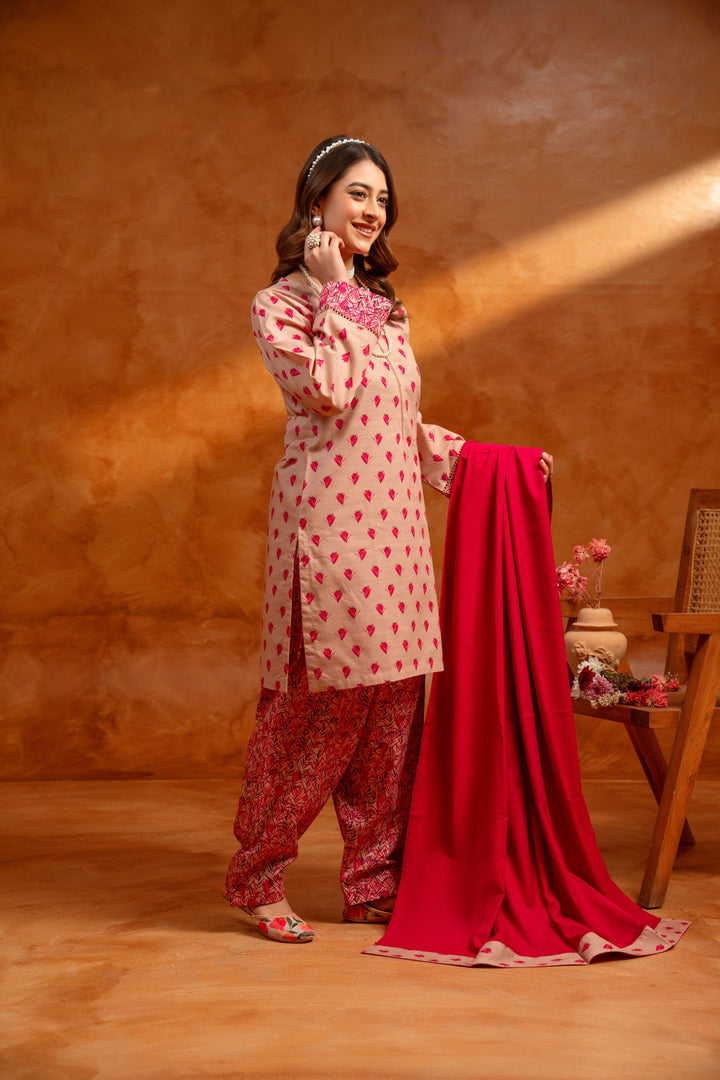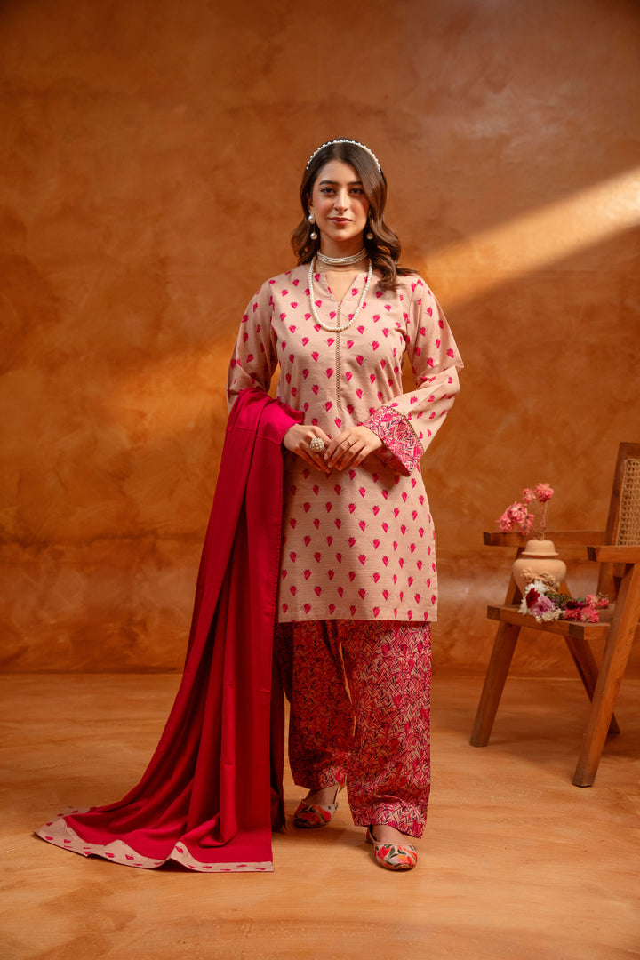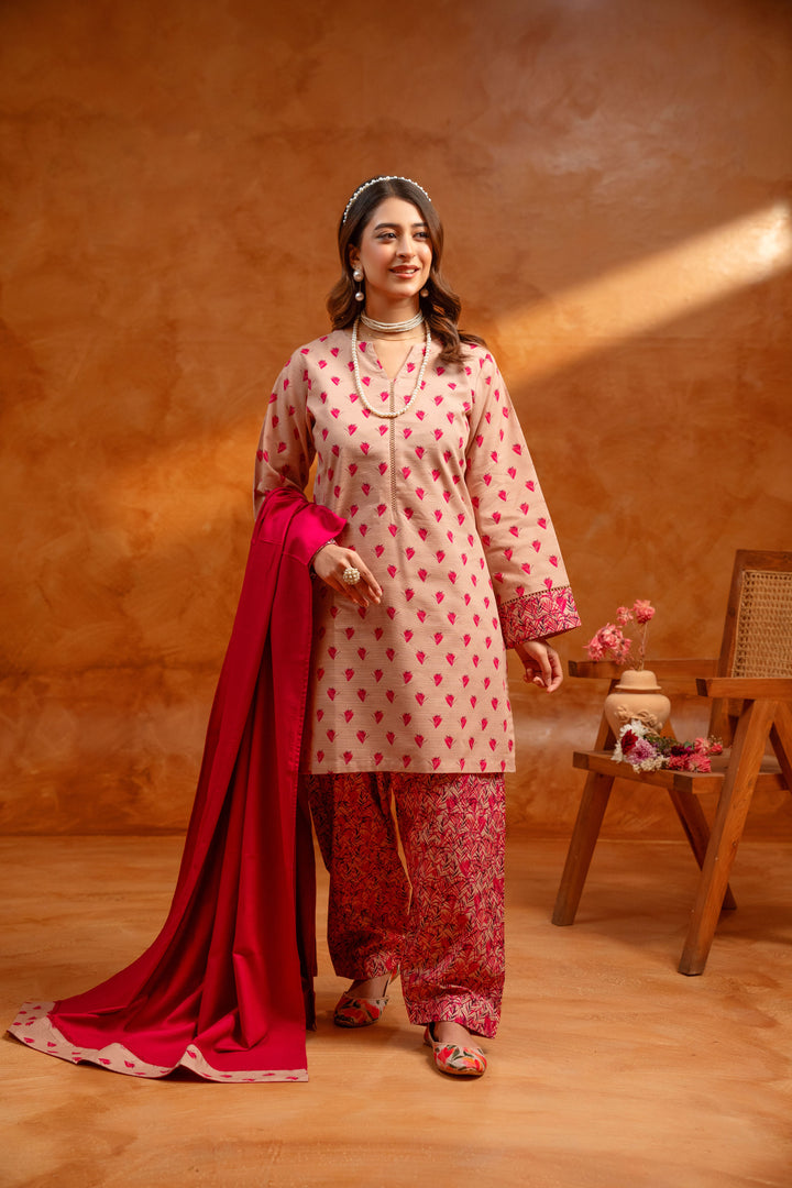 3-PIECE PREMIUM SLUB KHADDAR PRINTED STITCHED SUIT WITH SHALWAR