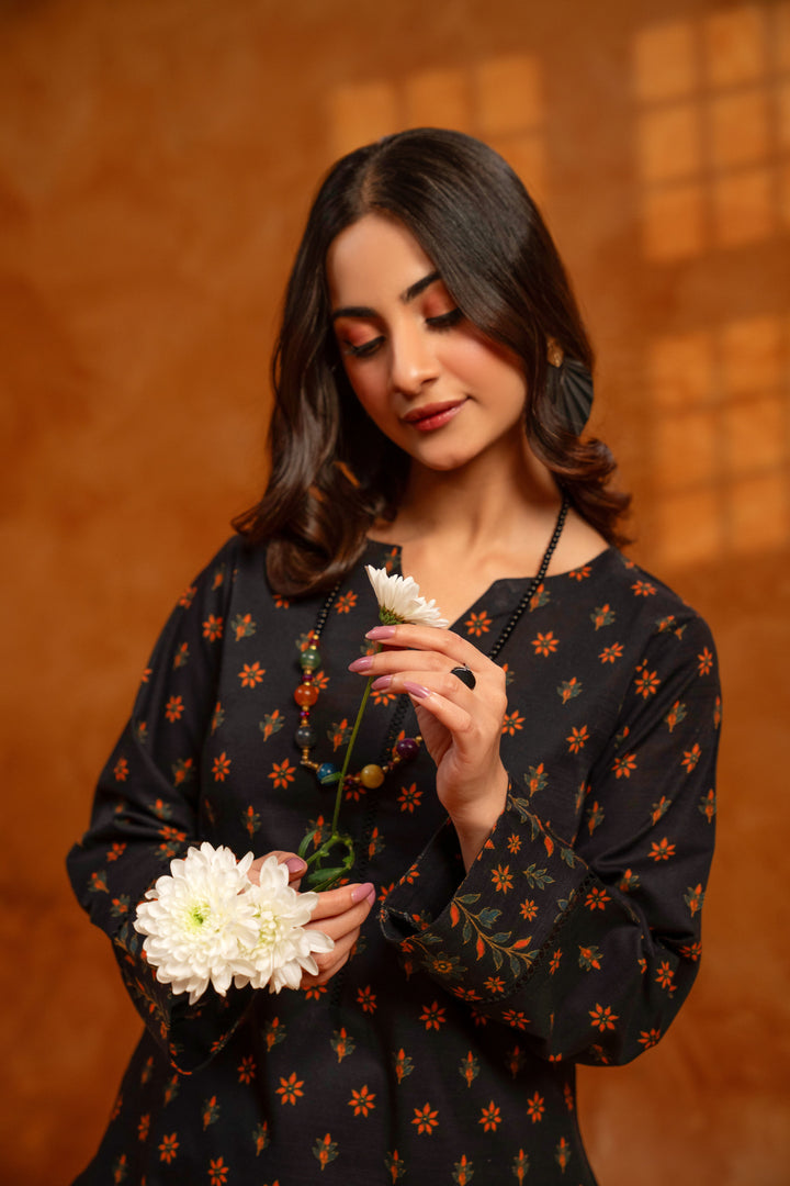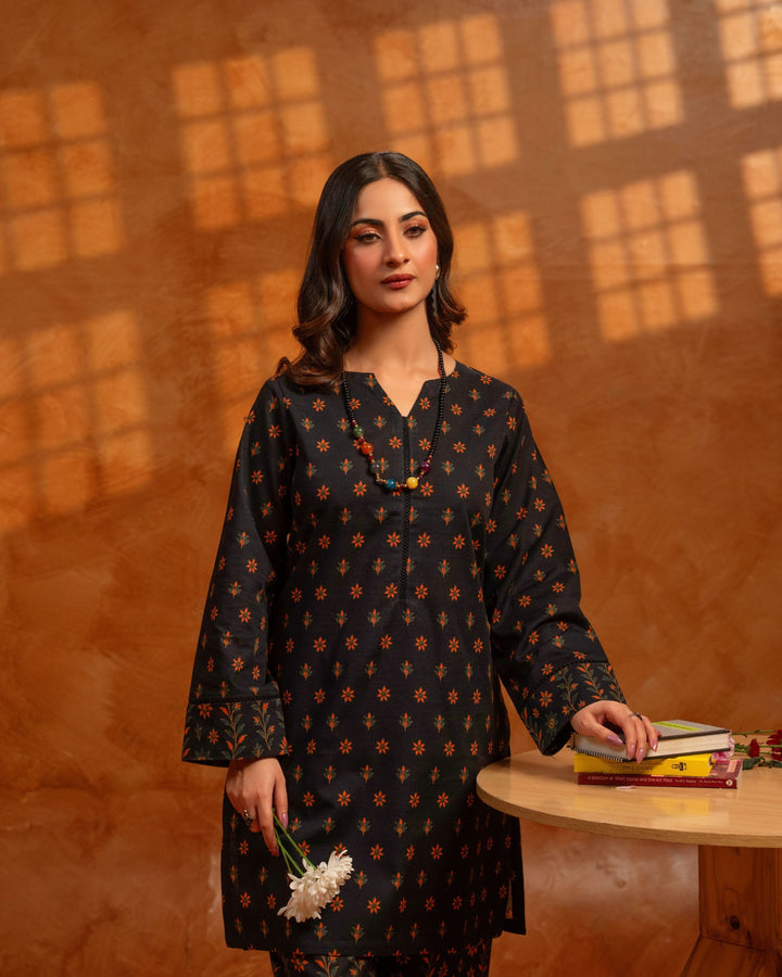 - Shalwar – Paired with a simple yet elegant Contrast Slub Khaddar shalwar, designed for effortless comfort and a traditional silhouette that perfectly complements the detailed shirt.
