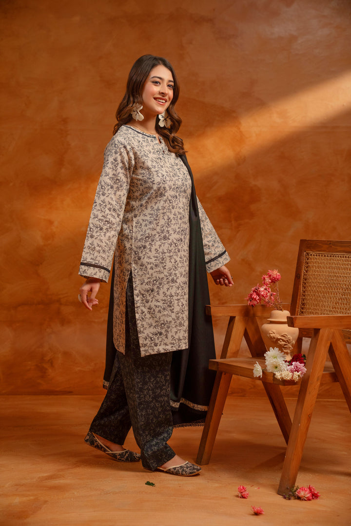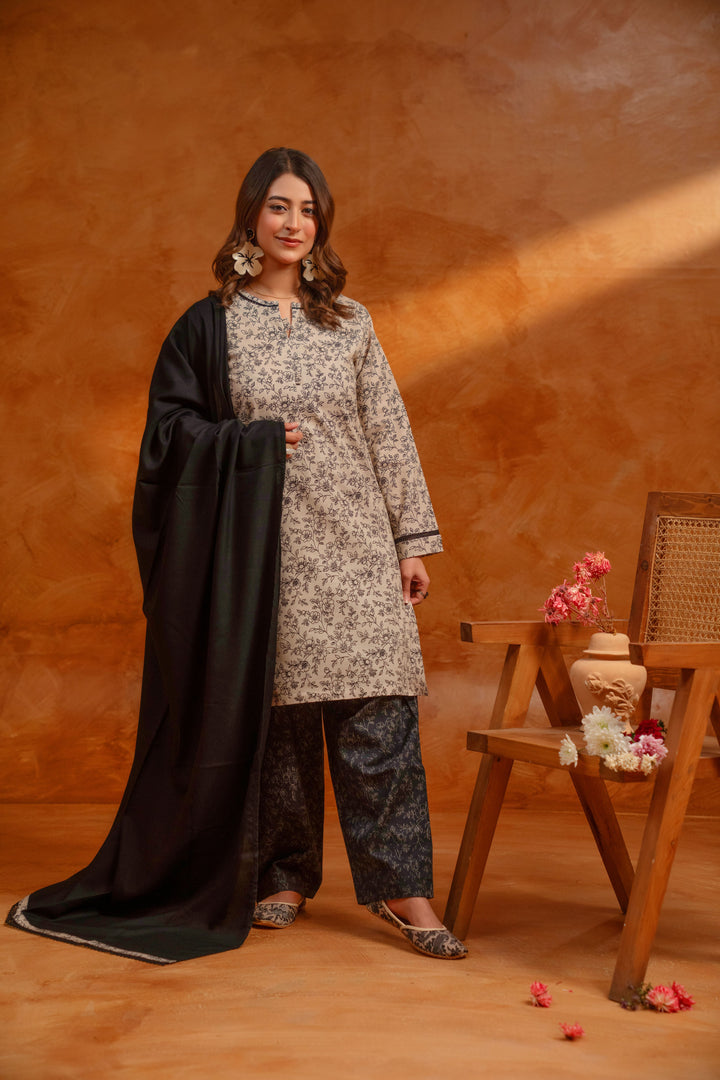 3-PIECE PREMIUM SLUB KHADDAR PRINTED STITCHED SUIT WITH SHALWAR