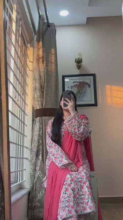 Effortless elegance in every detail: Lawn Cambric shirt with a round neckline featuring piping and button detailing, finished with delicate lace on sleeves and daman. Paired with matching lace-detailed trousers and completed with a soft chiffon dupatta adorned with lace on the corners for a graceful, refined look.