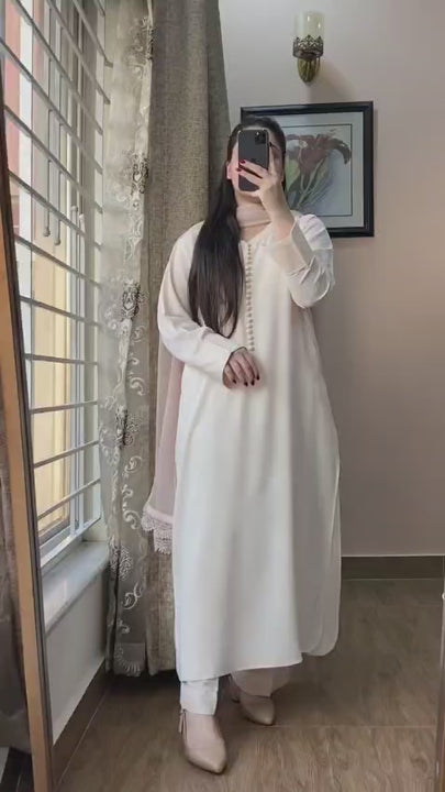- Shirt: Tailored from luxurious silk karandi, this shirt features a V-shaped neckline with delicate buttons and loops for a refined finish. Cut cuffs add a feminine touch, while practical pockets and a rounded daman complete the look with effortless grace.