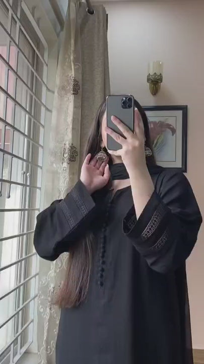 - Shirt: Tailored from premium silk karandi, featuring lacework on the sleeves and daman (hem), with buttons on the neckline for a delicate, detailed finish.