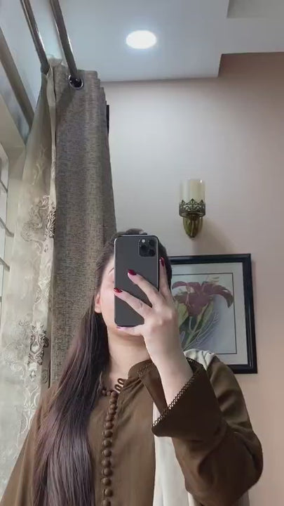 - Shirt: The shirt is tailored from luxurious silk karandi, featuring delicate buttons on the neckline that offer a refined, graceful finish. Lace detailing on the cuffs adds a soft, feminine touch, while the rounded daman enhances the silhouette with a natural flow.