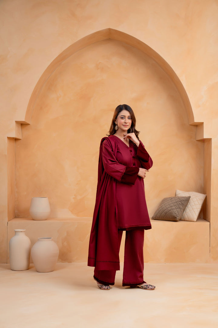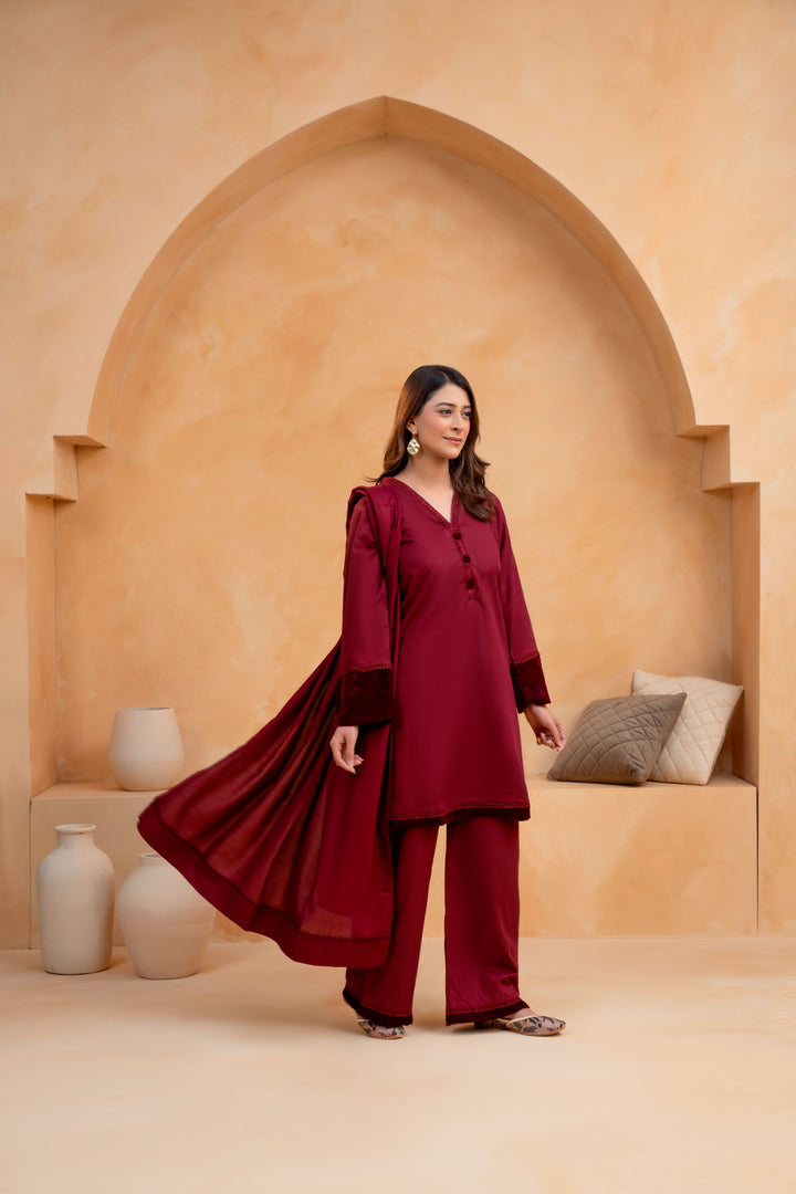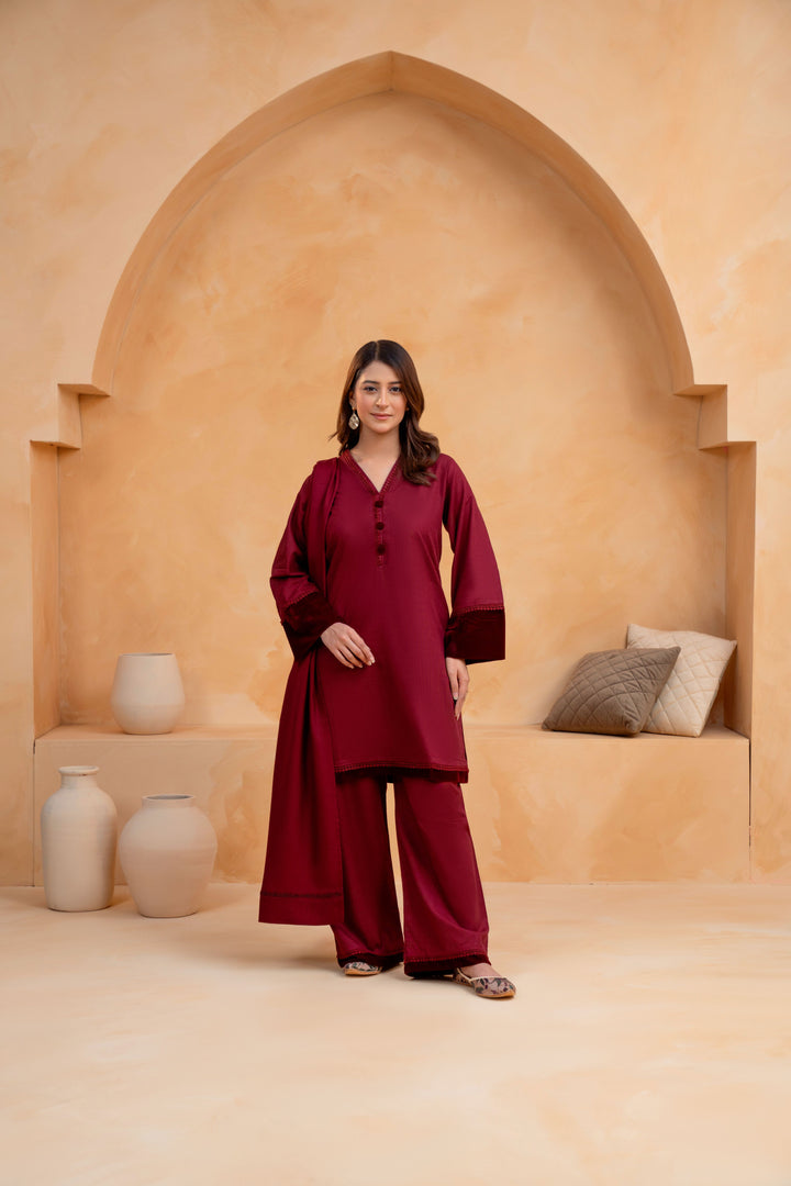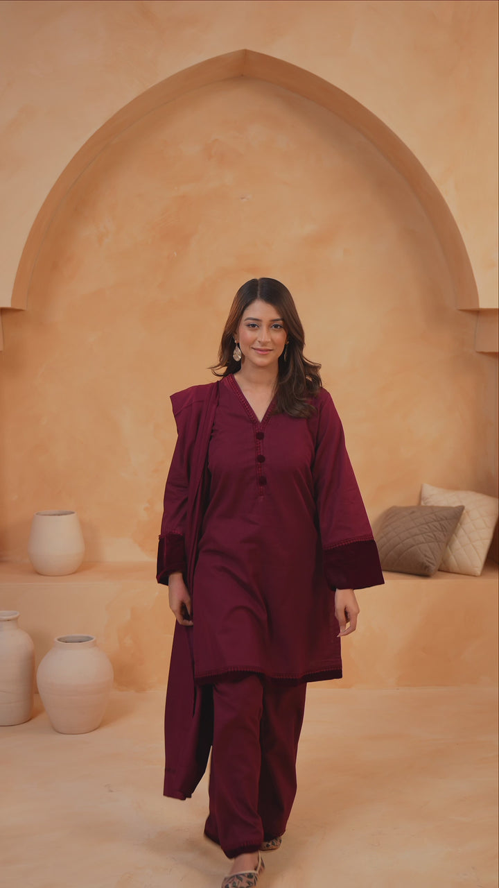 A perfect harmony of winter charm and refined craftsmanship, this 3-piece Slub Khaddar suit offers both comfort and understated elegance. Thoughtfully detailed with lace and velvet accents, it’s designed to add a touch of sophistication to your seasonal wardrobe.
