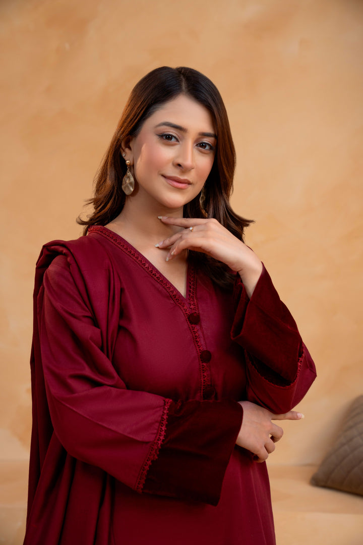 - Shirt – Crafted from premium Slub Khaddar, the shirt features a delicately embellished neckline adorned with fine lace and elegant buttons, creating a refined feminine appeal. The sleeves are enhanced with a narrow lace trim and a rich velvet patch, while the daman is finished with matching lace and velvet detailing, adding depth and seasonal warmth to the design.
