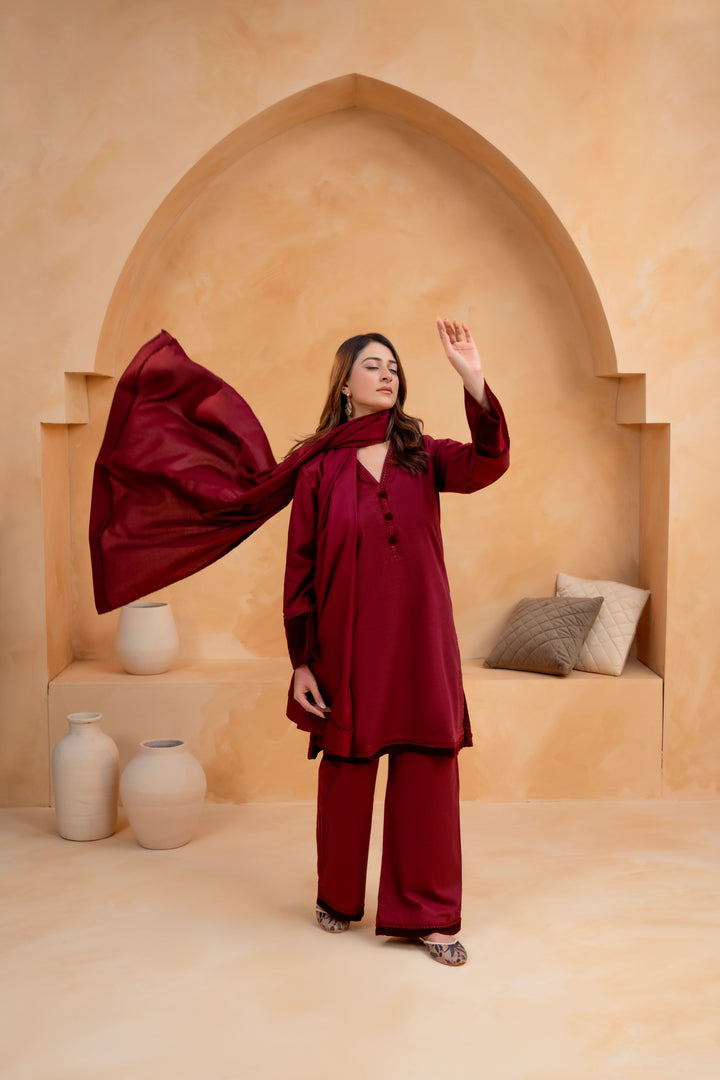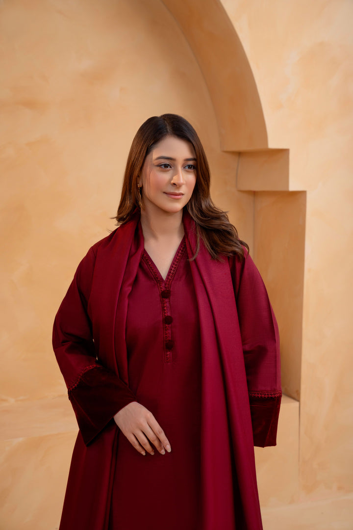 3-Piece Slub Khaddar Stitched Suit with Dhanak Shawl