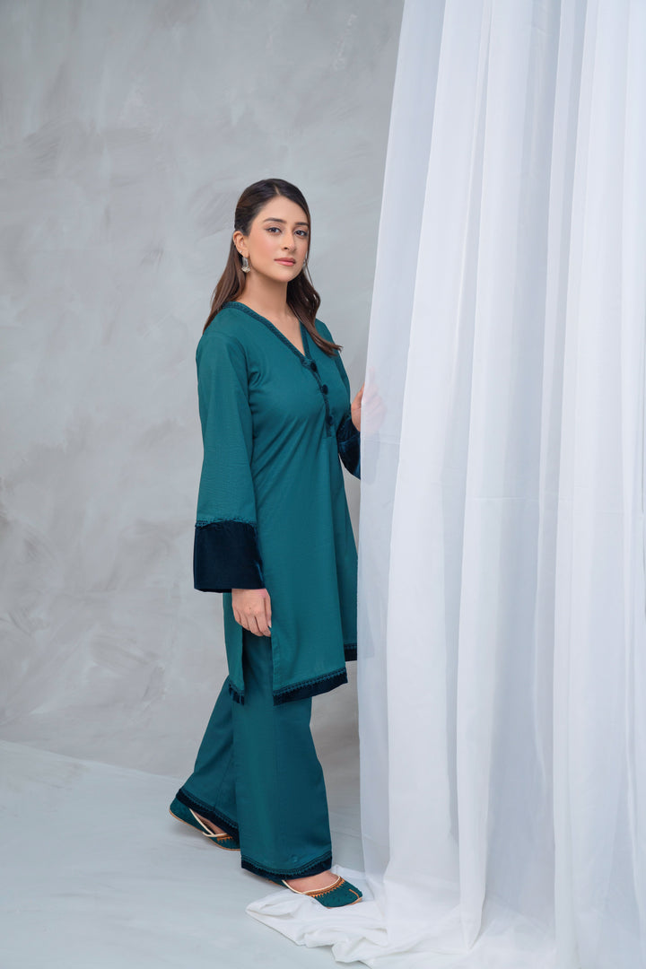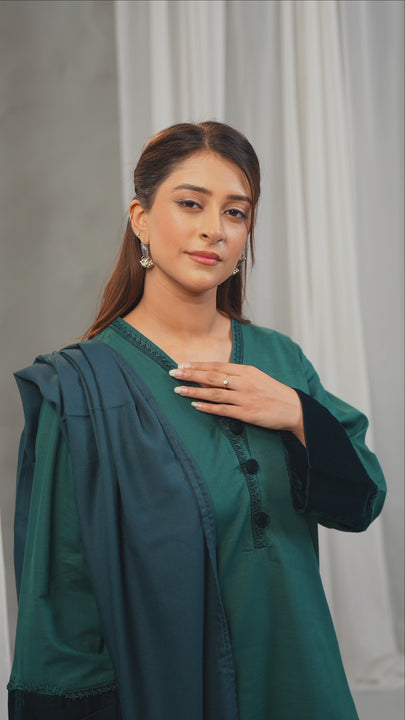 A perfect harmony of winter charm and refined craftsmanship, this 3-piece Slub Khaddar suit offers both comfort and understated elegance. Thoughtfully detailed with lace and velvet accents, it’s designed to add a touch of sophistication to your seasonal wardrobe.